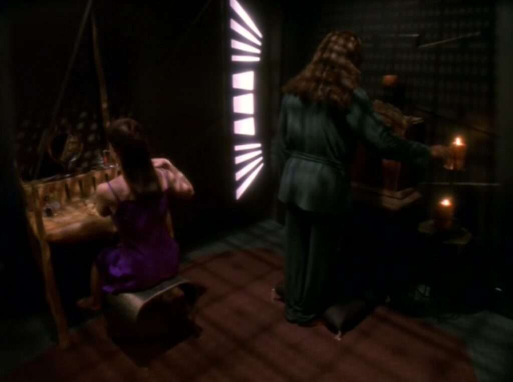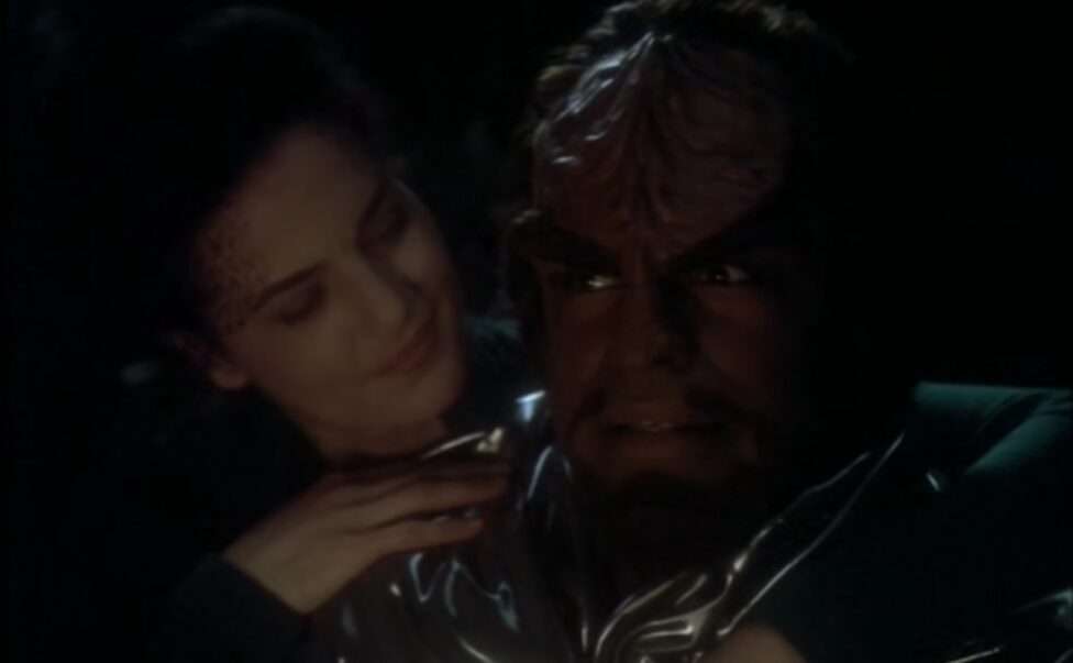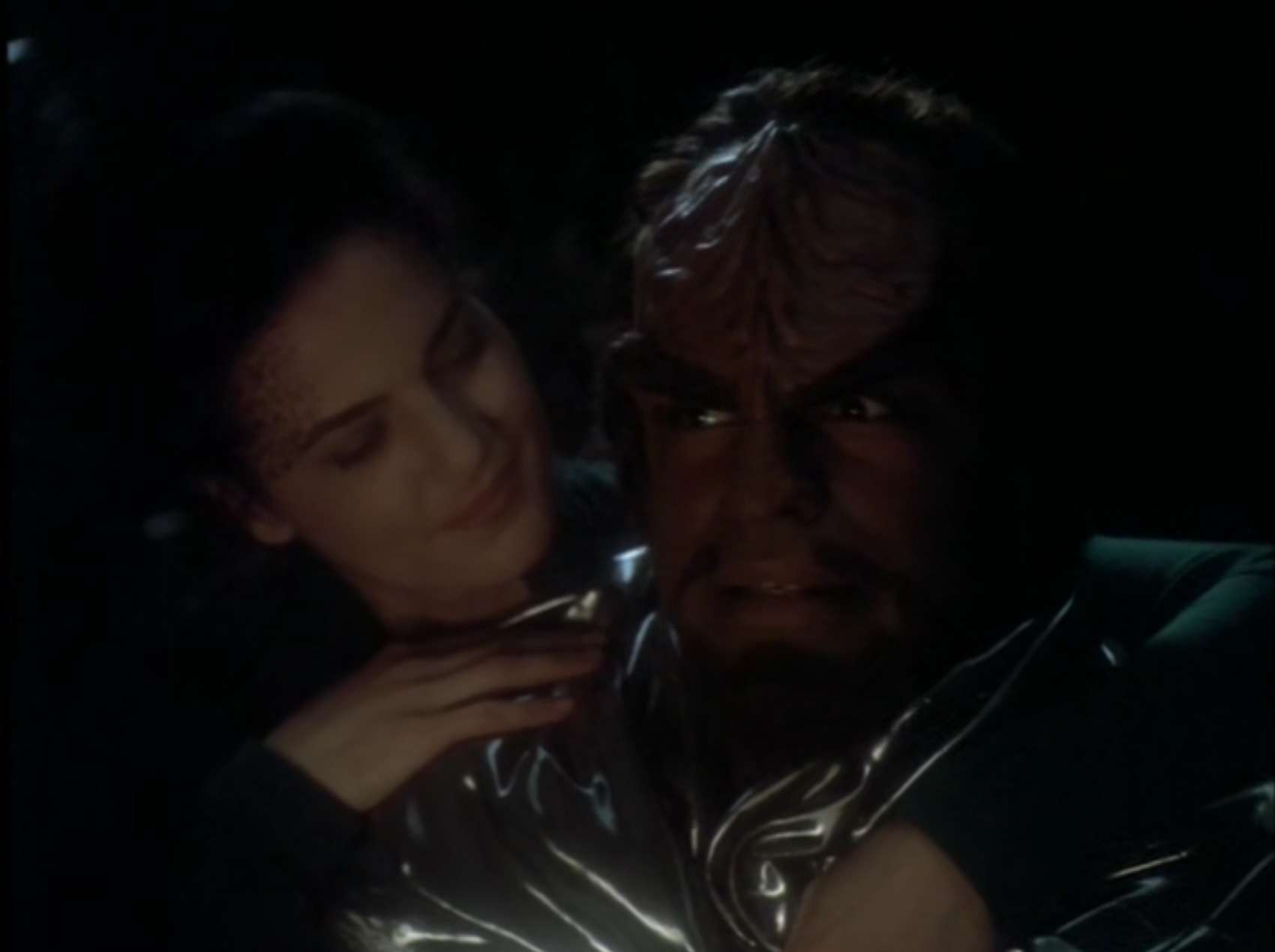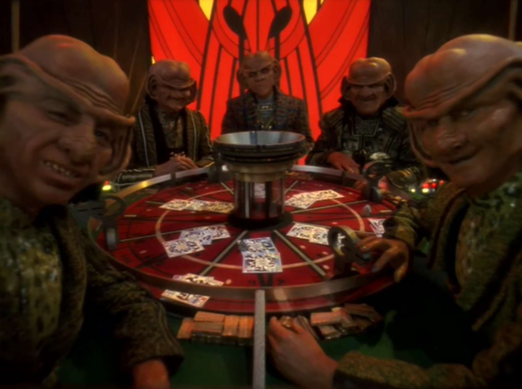 - The story is set up structurally different as the B plot (about Quark & Tongo) ends about halfway through the episode. The DS9 companion book says that’s because they didn’t want it changing the tone of the more serious A plot towards the end of the episode.