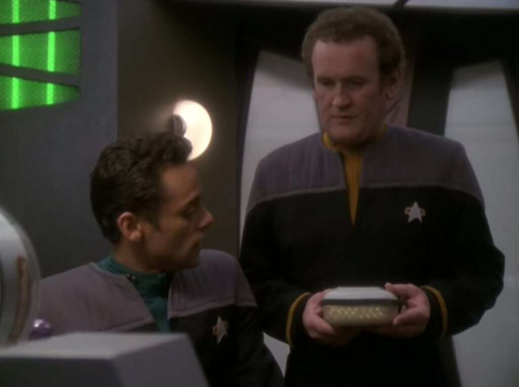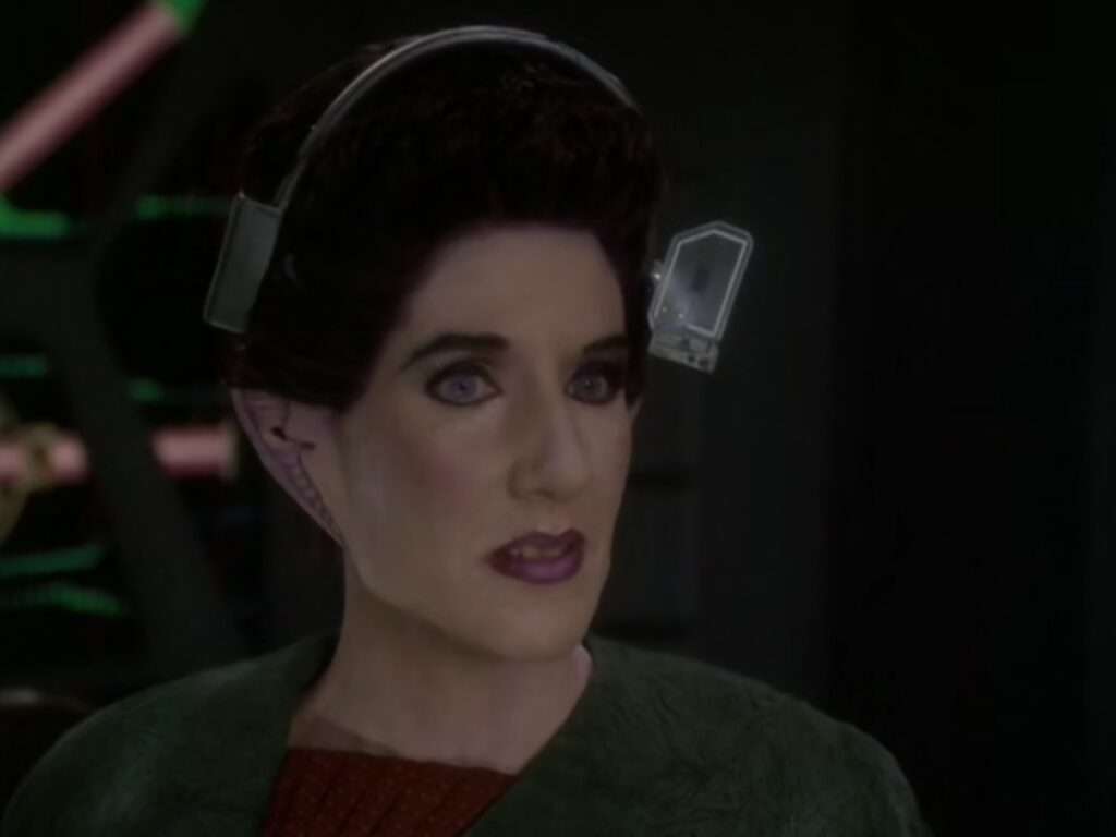 - Quark is not in this episode (or the next one) as Armin Shimernan was apparently filming episodes of Buffy the Vampire Slayer. However, Shimerman’s wife (Kitty Swink) appeared here was Luaran (a Vorta) – she had been in DS9 before in the “Sanctuary” episode (as Rozahn). There is a picture of her from this episode below.