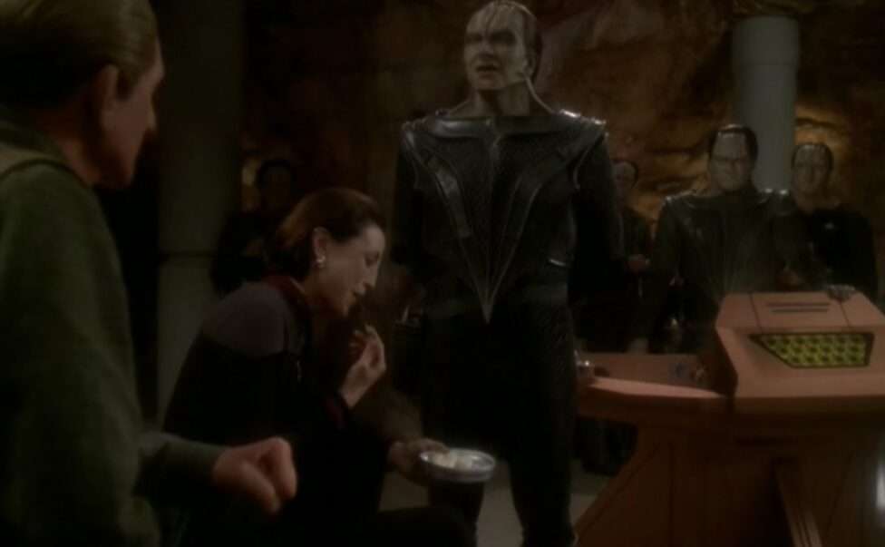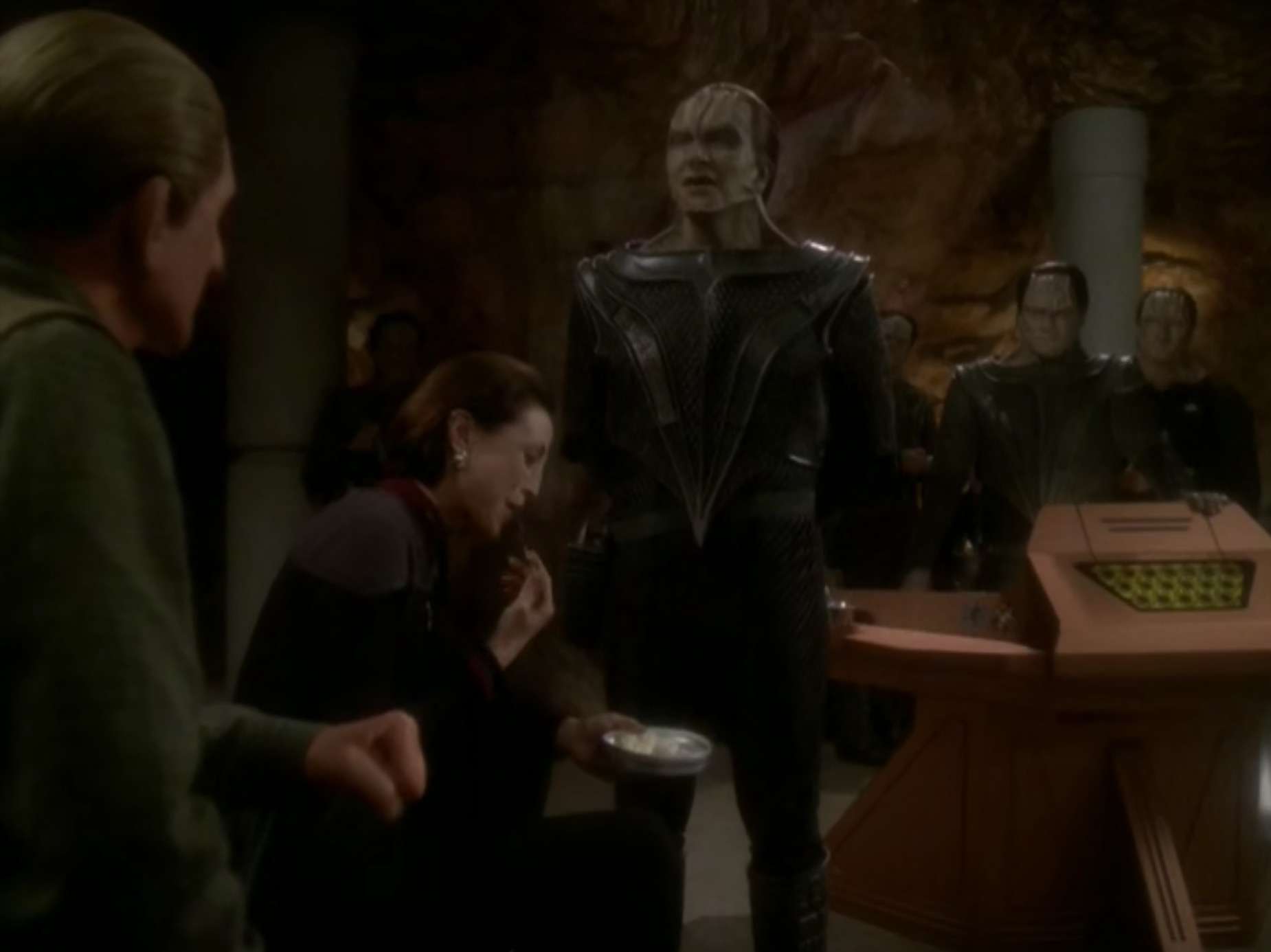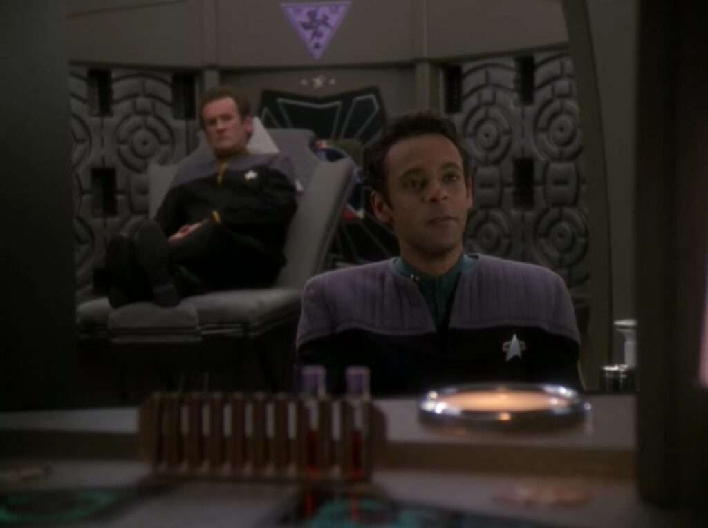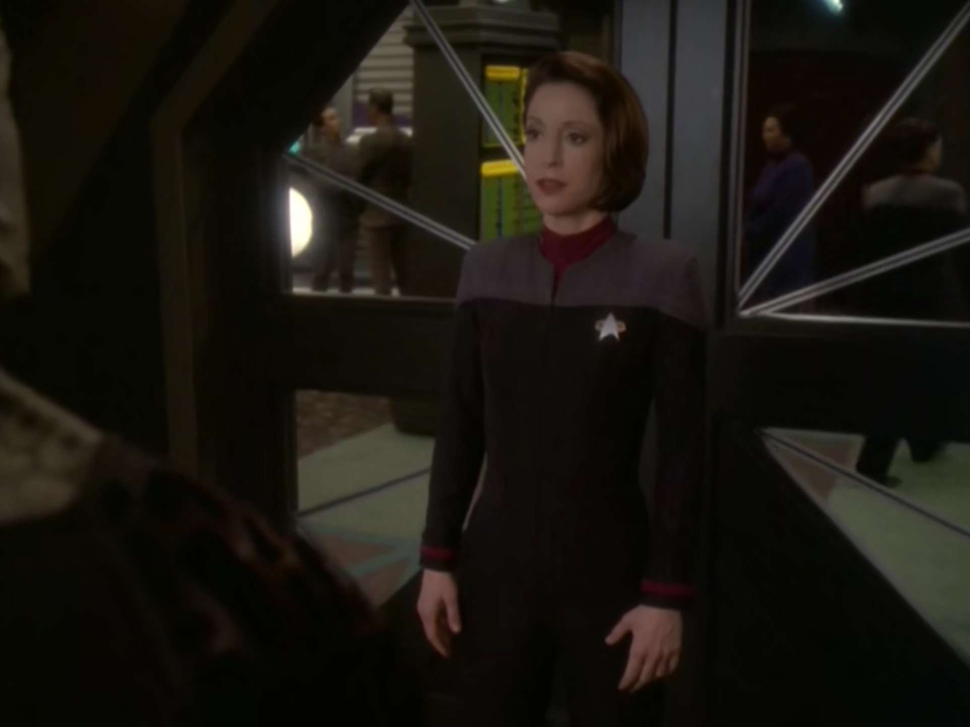 • Kira is given a Federation commission for the purposes of this mission, and as such wears a Federation uniform – the first time she’s done that in 171 episodes of Deep Space Nine.