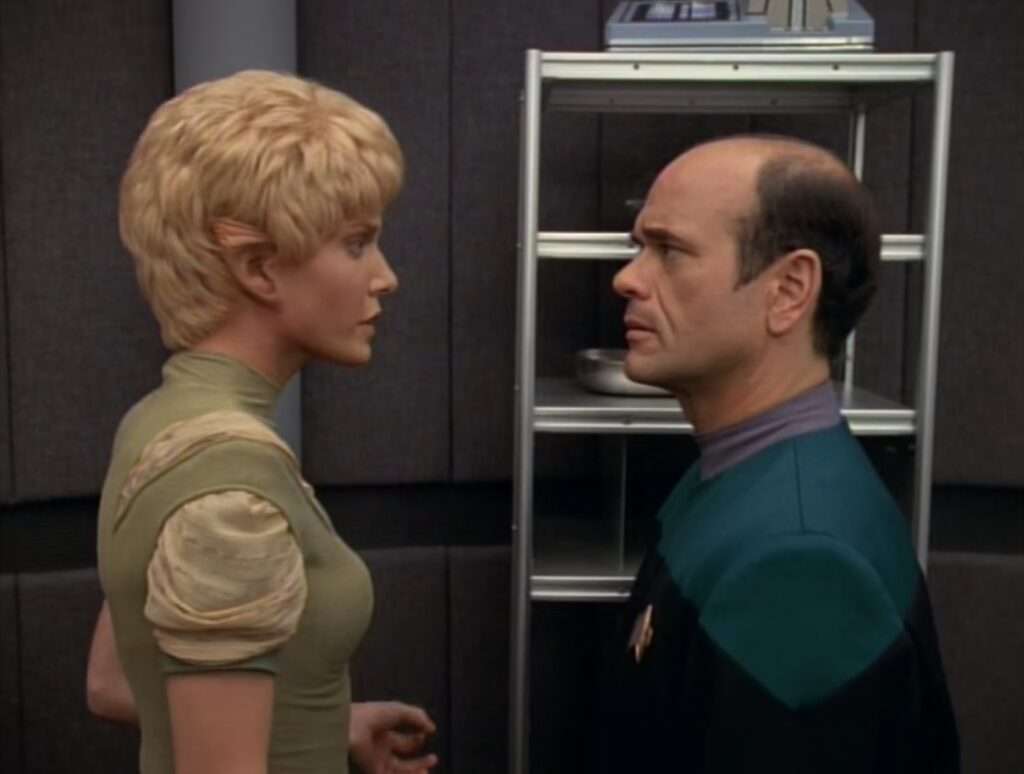• The first episode of thirteen episodes with Martha Hackett as Seska.  Hackett had previously appeared on DS9 in “The Search Pt I” as a Romulan.