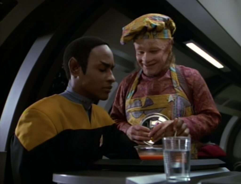 - Rob LaBelle plays the Talaxian prisoner here. He was also Kafar in the episode “False Profits” and a different Talaxian (Oxilon) in the episode “Homestead“.