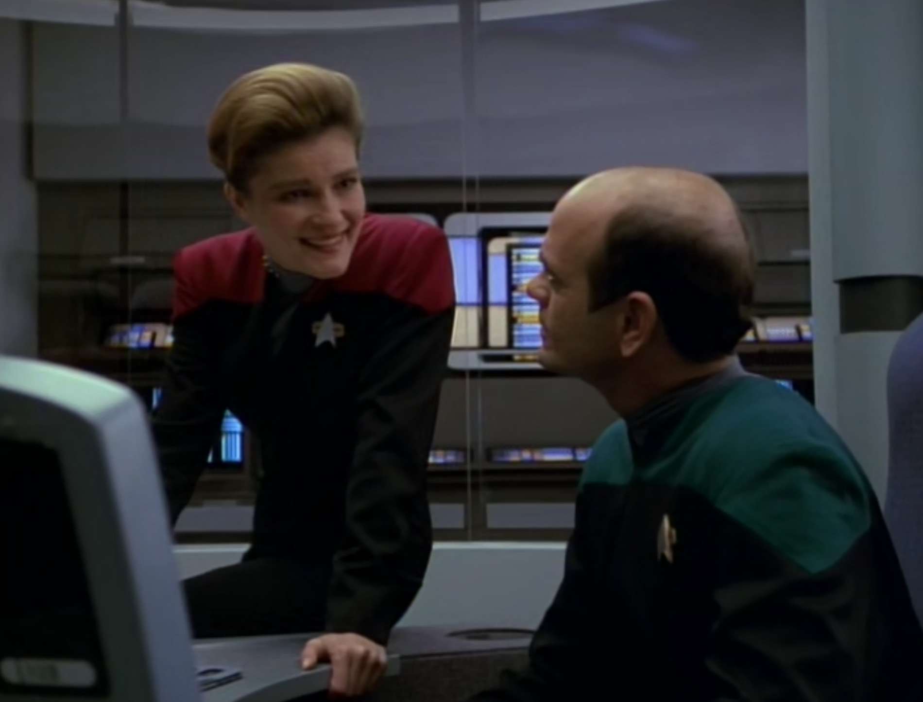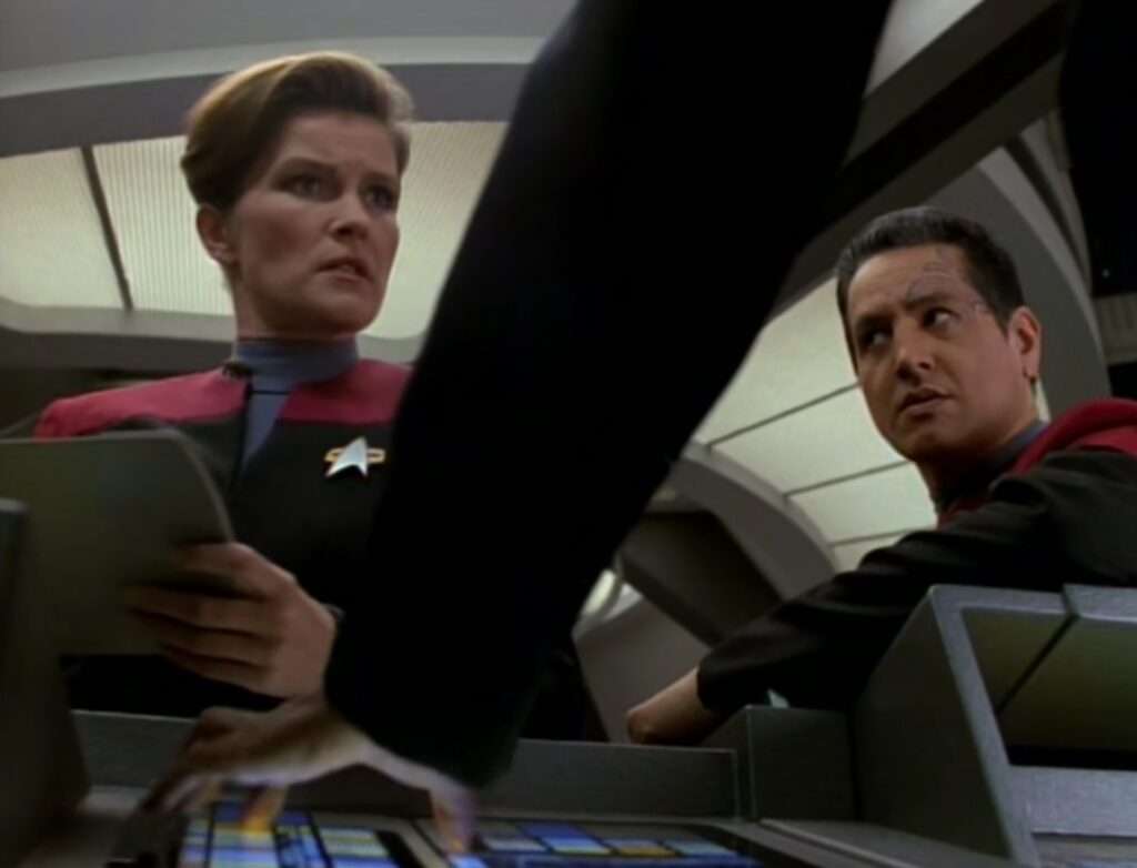 - Kate Mulgrew’s real hair is worn in this episode (and the next, but it was dropped after that).