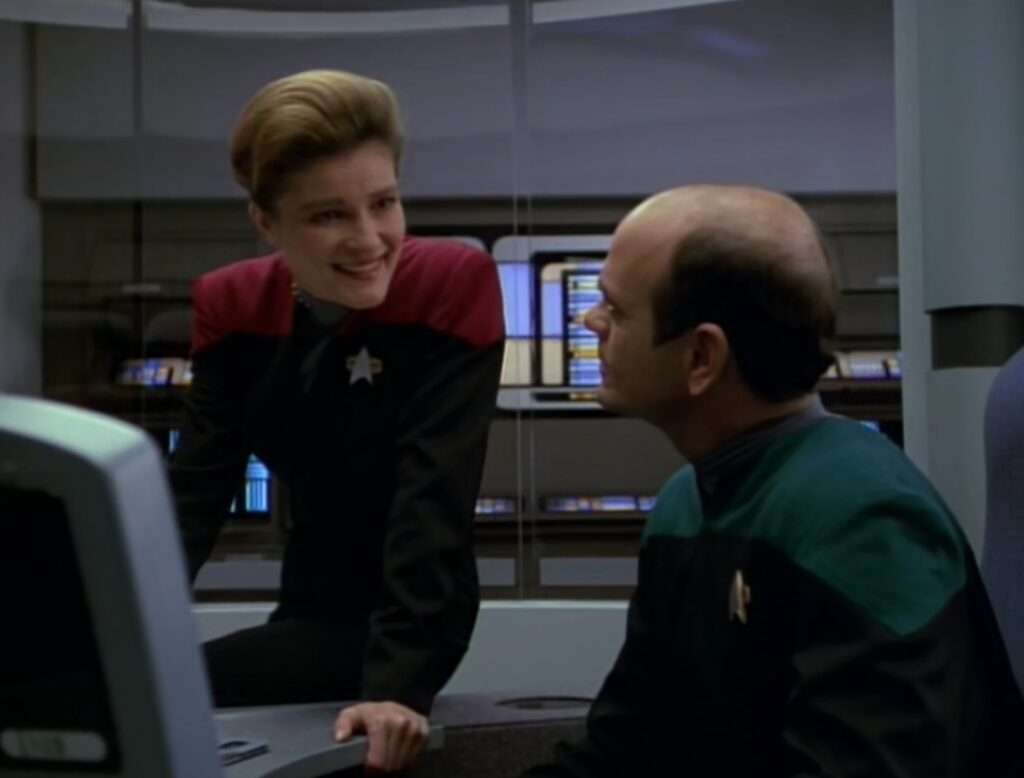 - Some of the music written for this episode was originally written for the TNG episode “QPid“, but never used there.