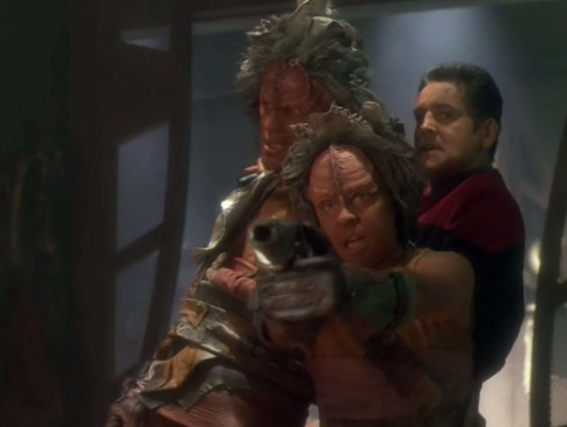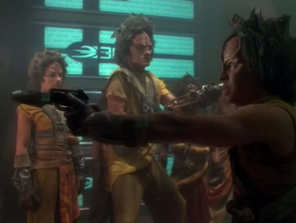 - Patrick Kilpatrick plays the Kazon Rasik here. He was also Assan in Voyager’s “Drive” as well as Reese in the most excellent DS9 episode “The Siege of AR-558“.