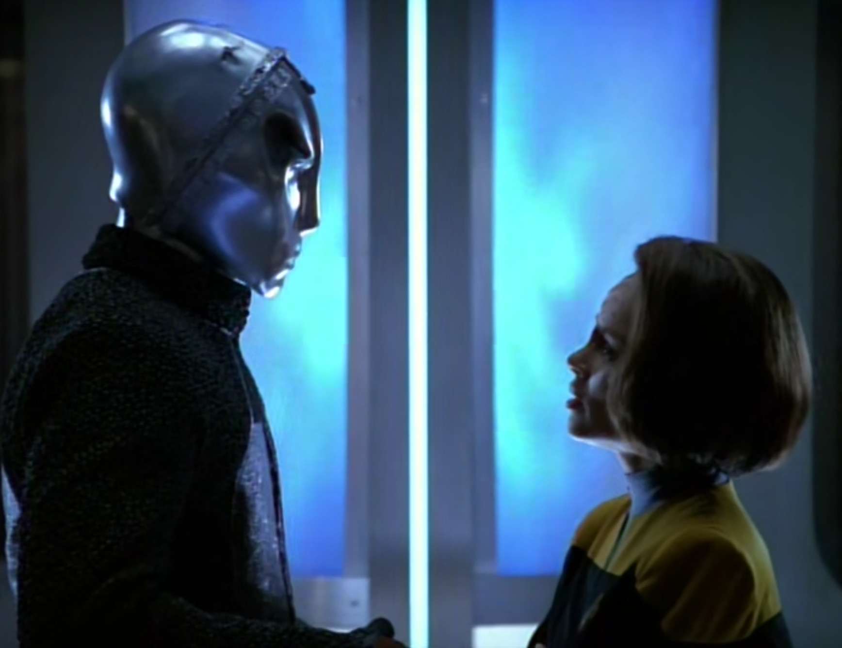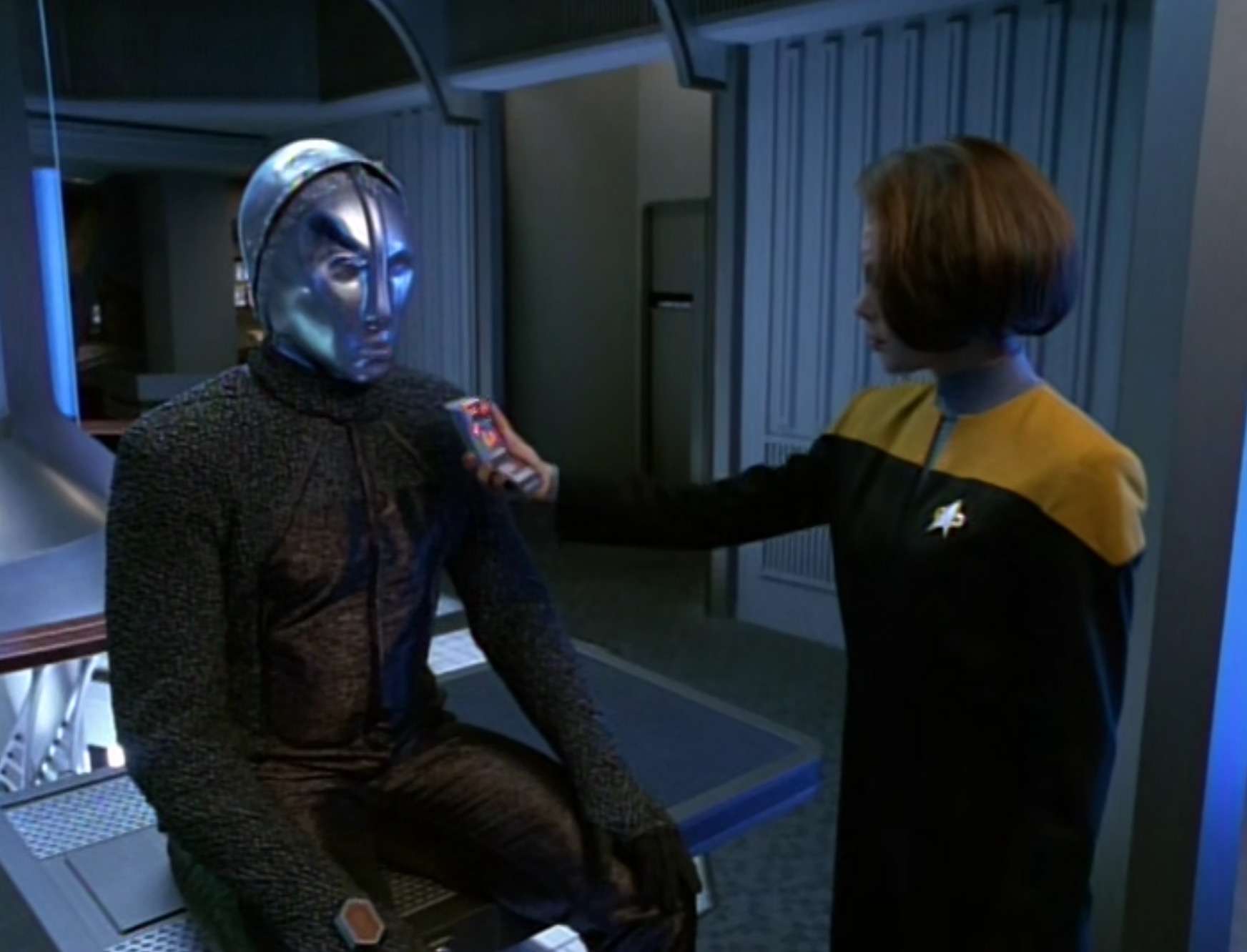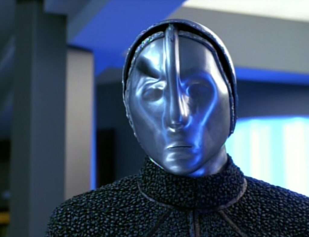 • Automated Units 3947 & 122 were played by Rick Worthy.  He was also the Klingon Kornan on DS9’s “Soldiers of the Empire“, an Elloran officer in Star Trek: Insurrection, crewman Noah Lessing in “Equinox” and “Equinox, Pt II“, as well as Jannar from Star Trek Enterprise (multiple episodes).