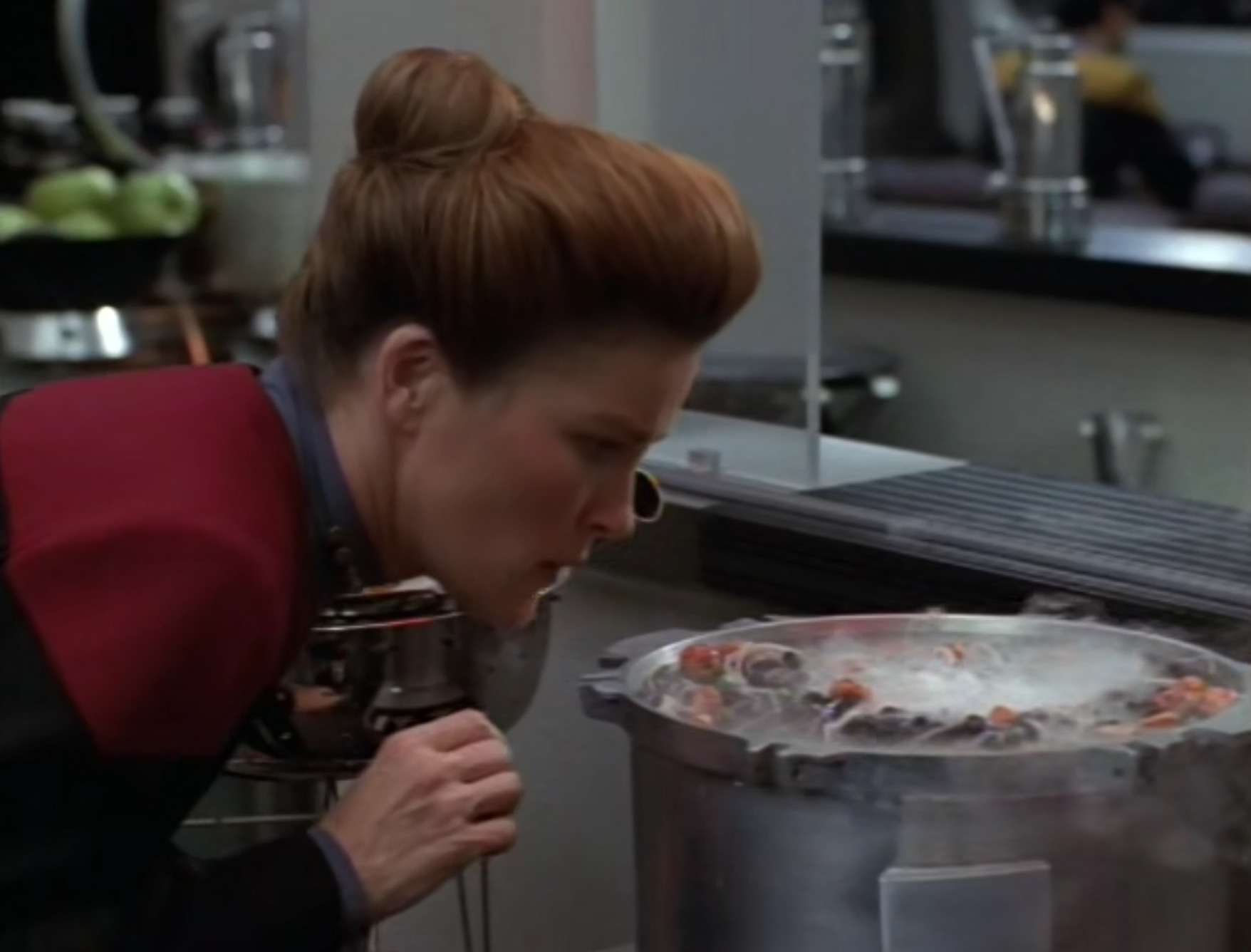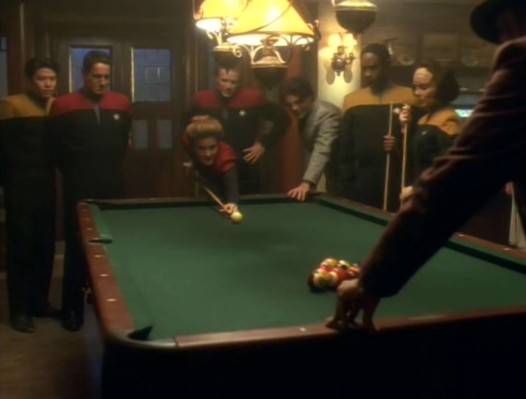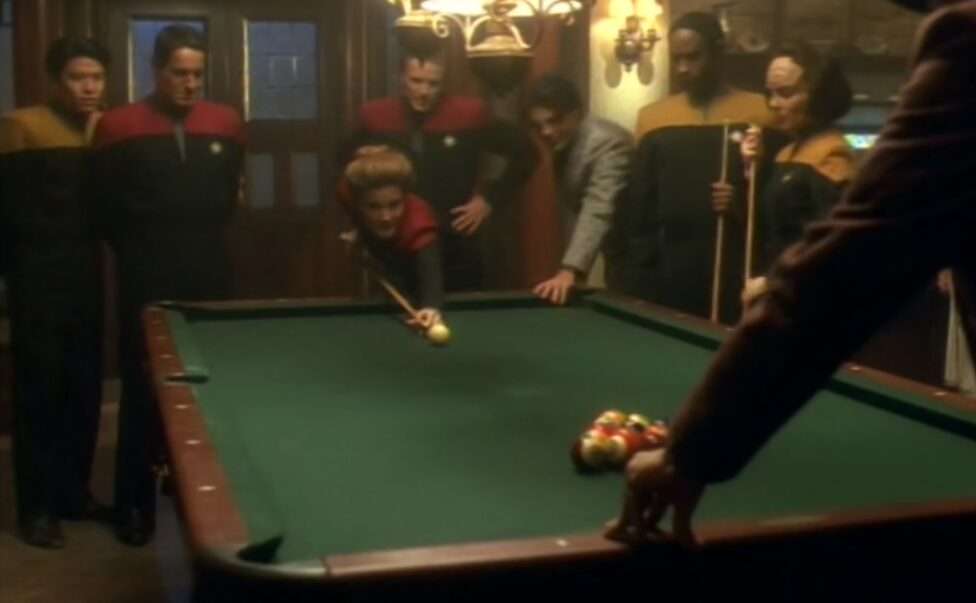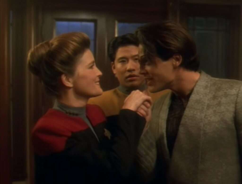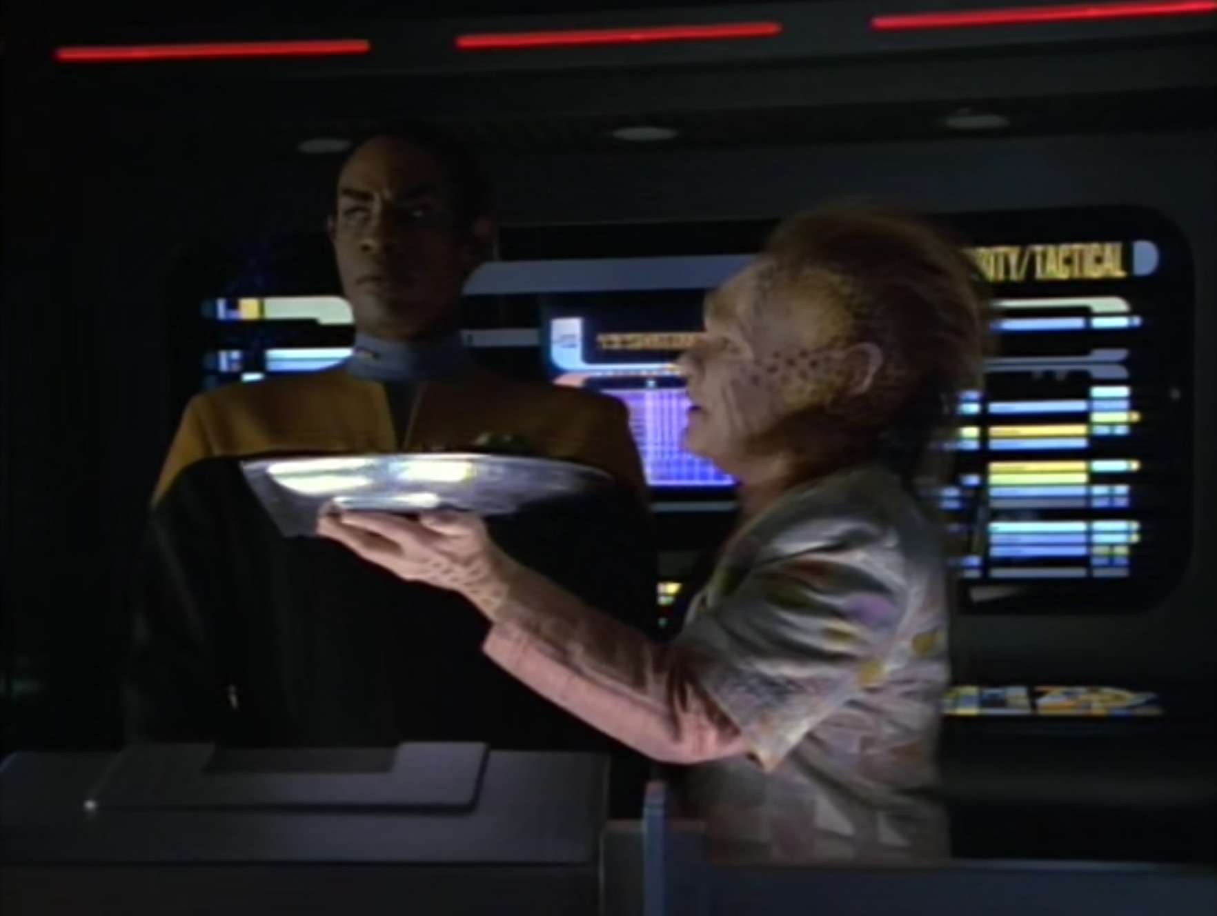- Via a voice over (capt’s log), it’s said that several weeks have passed since the last episode, and that the crew has become “an extended family” – goodbye Maquis conflict.