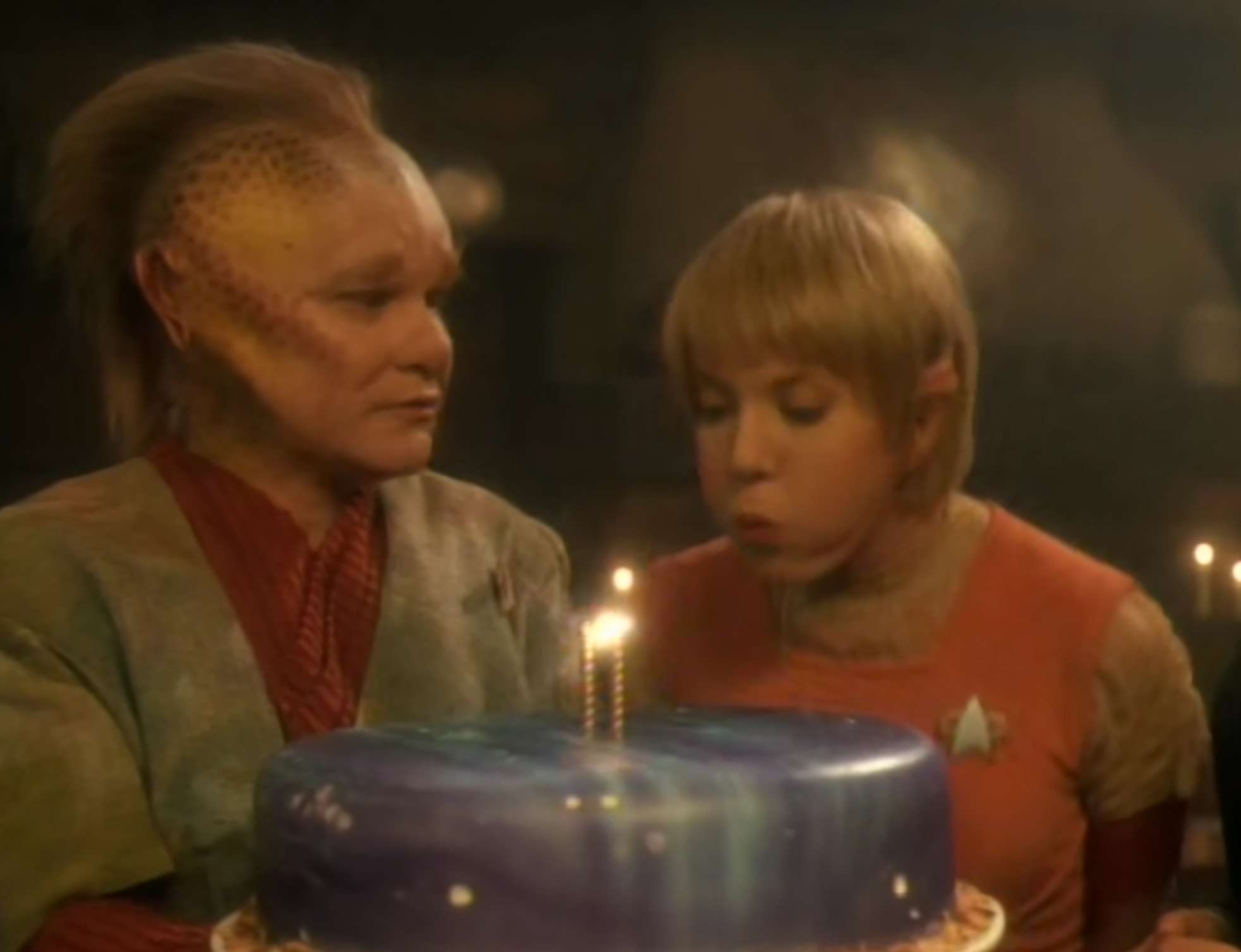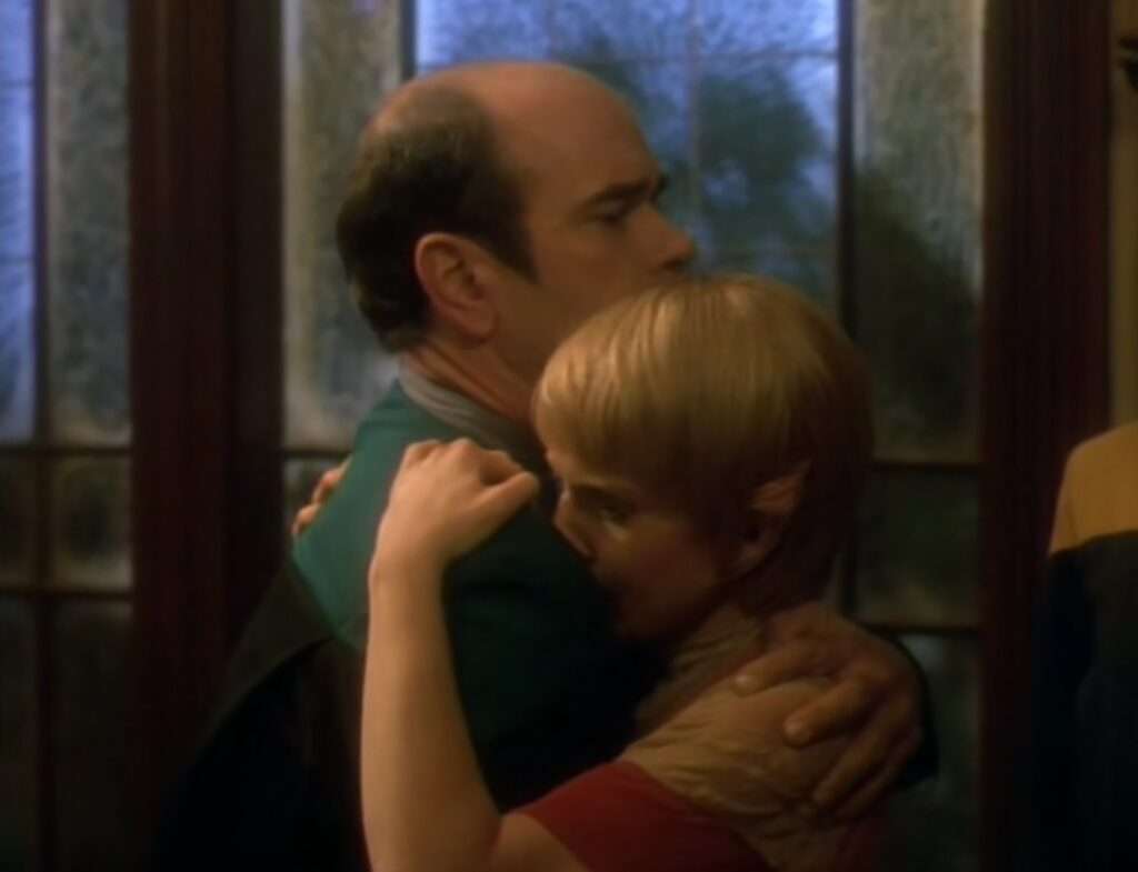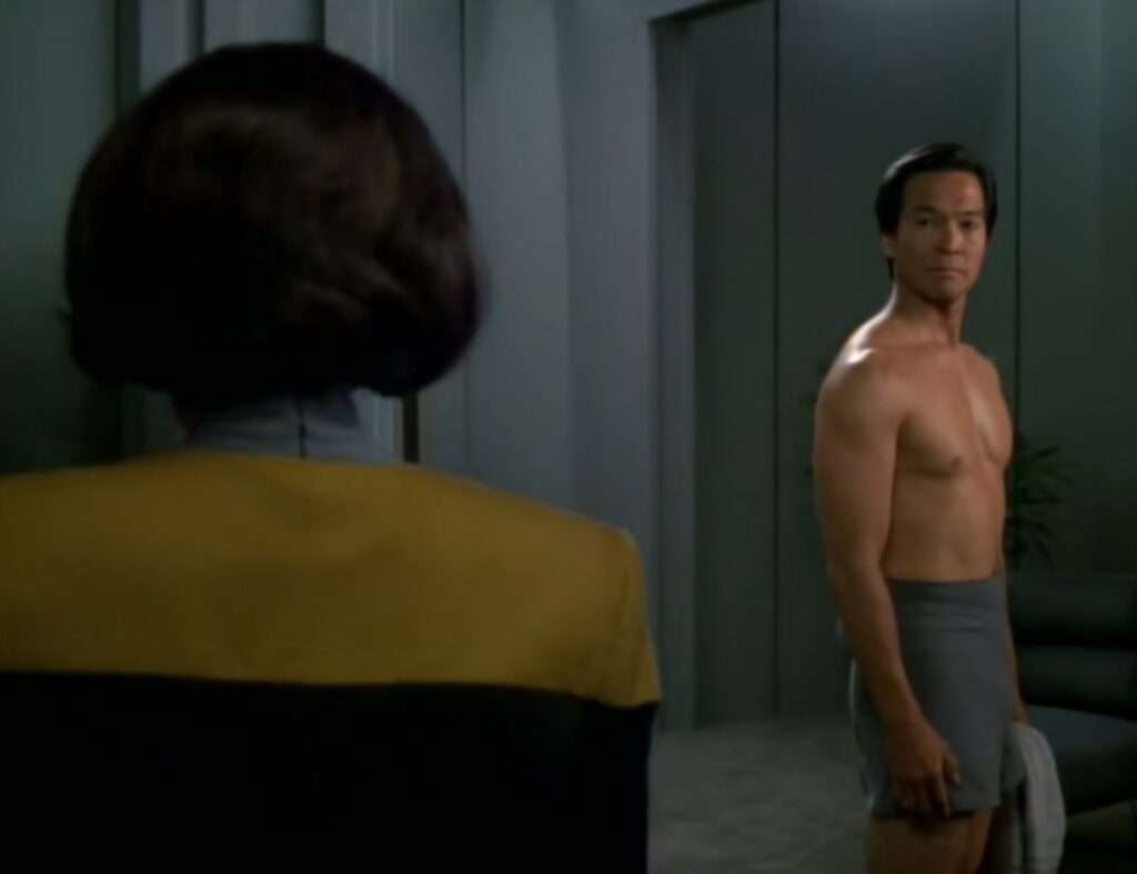 • Larry Hankin plays “Gaunt Gary” (a holodeck character) in this episode as well as “Jetrel” & “The Cloud“.  He was also a disembodied head in the TNG episode “Cost of Living” (uncredited).