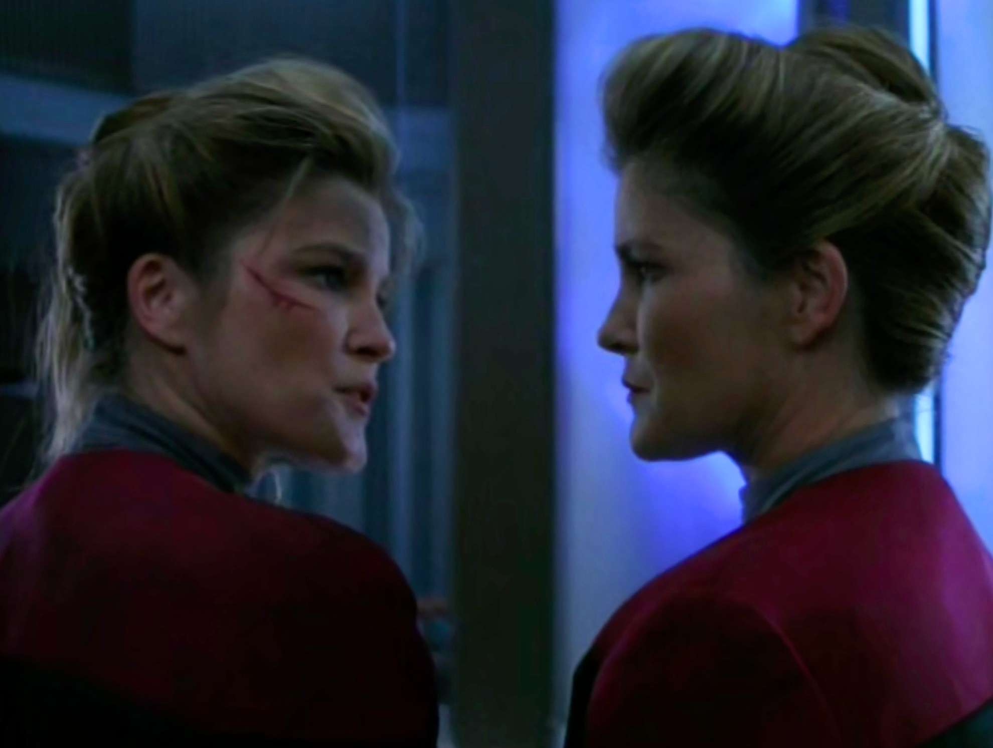 - The first time (of two) that Janeway meets herself. The other time is the finale.