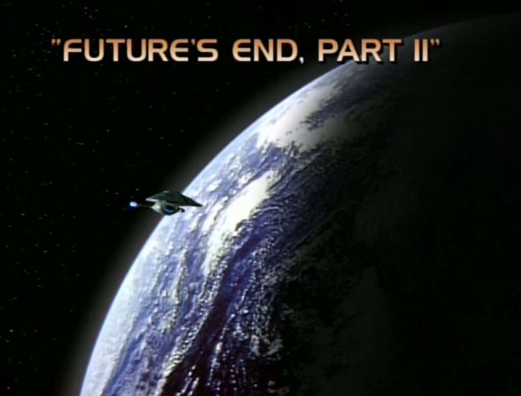 - Technically Part I of this is just called “Future’s End”, not “Future’s End Part I” – this is inconsistent across Star Trek incarnations. Some have Part I, others (like this) do not.