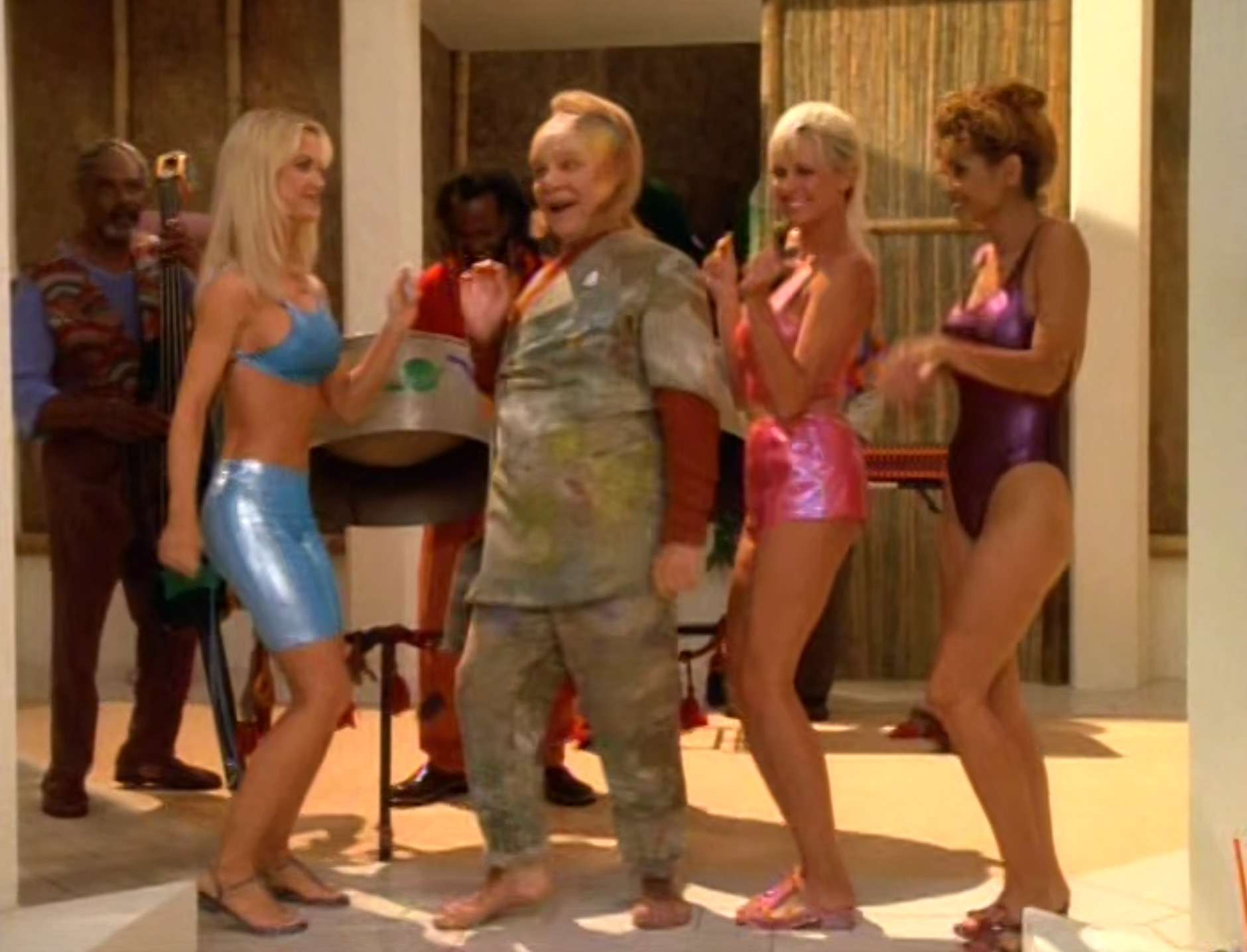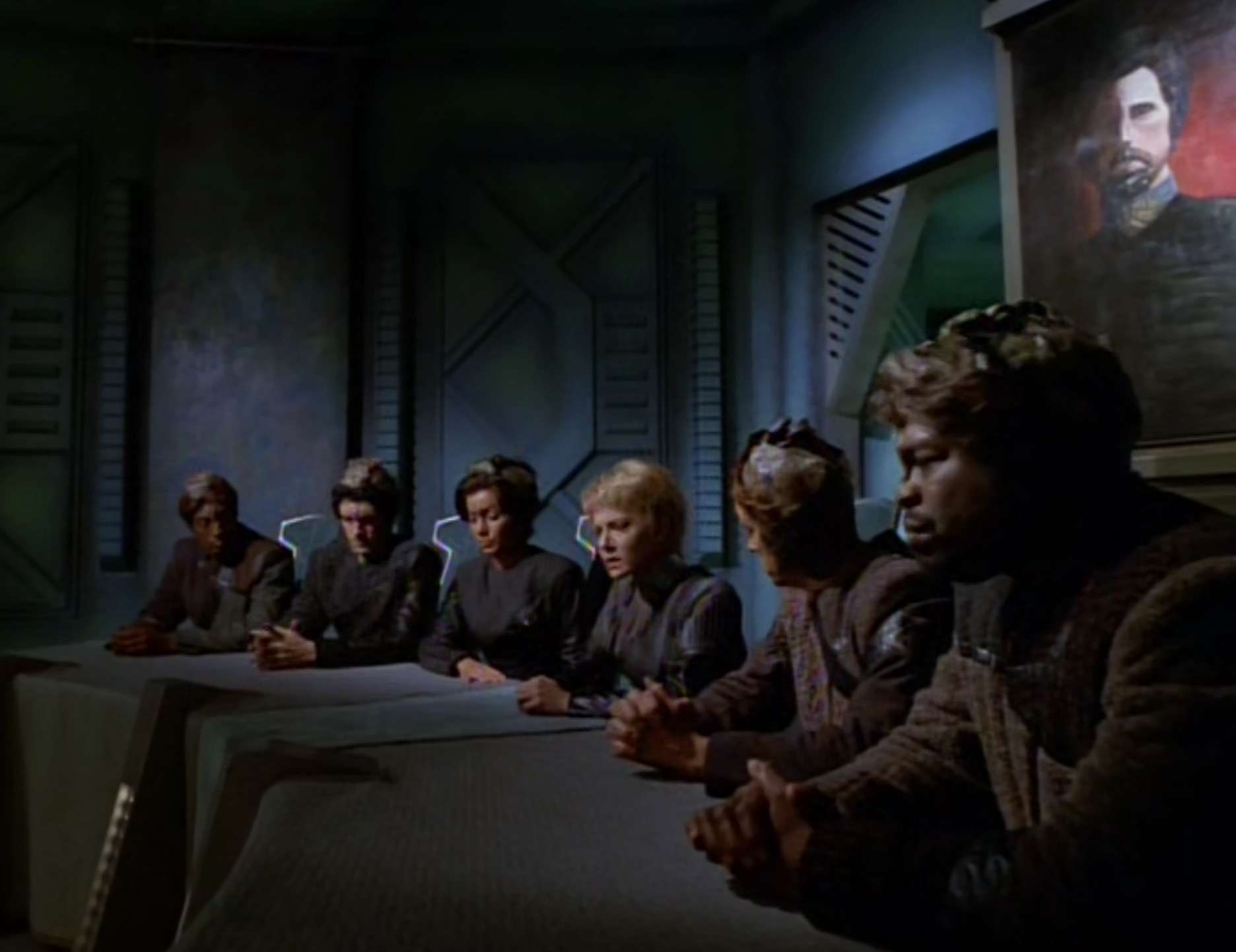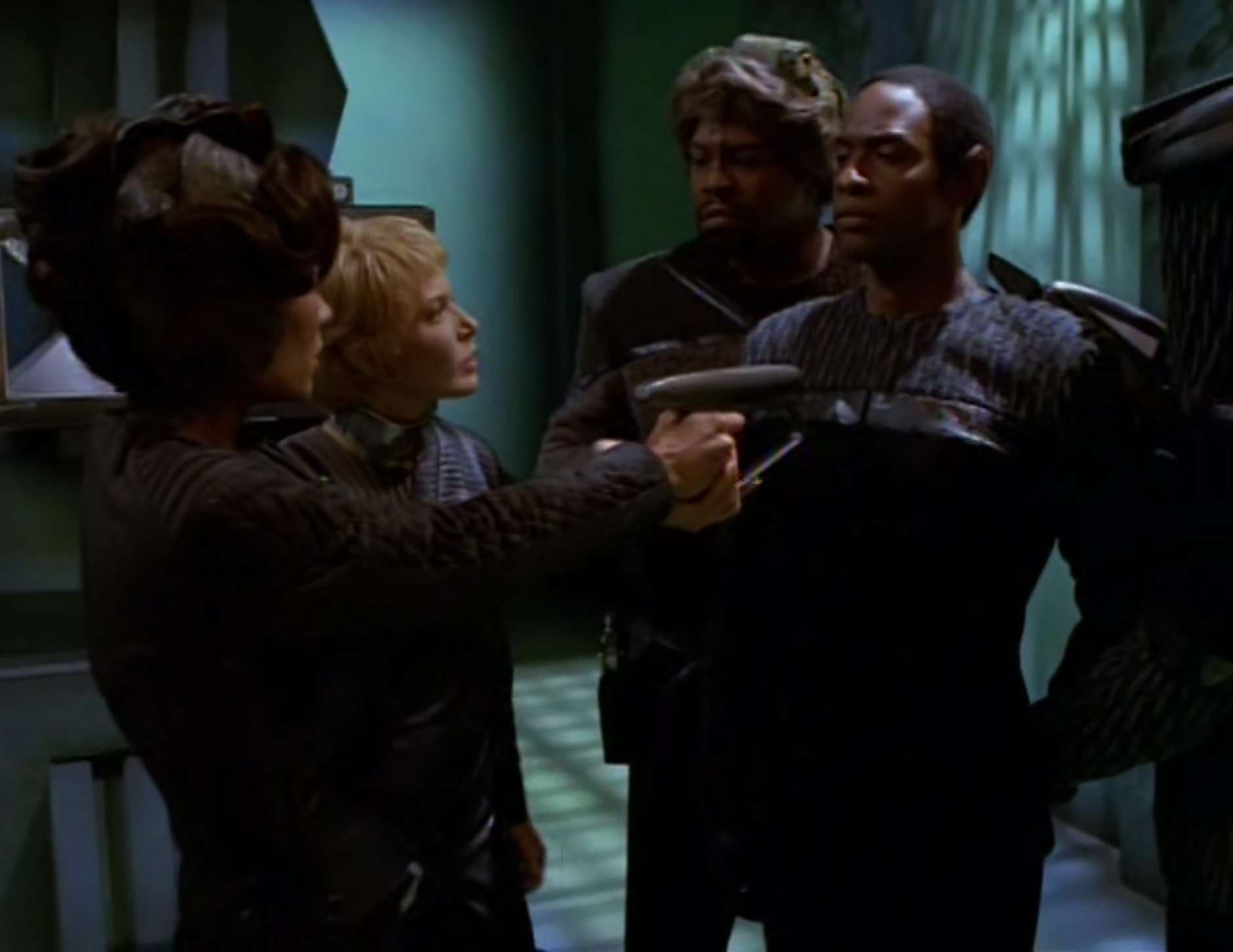 • Brad Greenquest plays Demmas here.  He was also Krit in DS9’s “Who Mourns for Morn?“, Zshaar in Enterprise’s “Dawn“, and a Rigelian kidnapper in Enterprise’s “Affliction“.