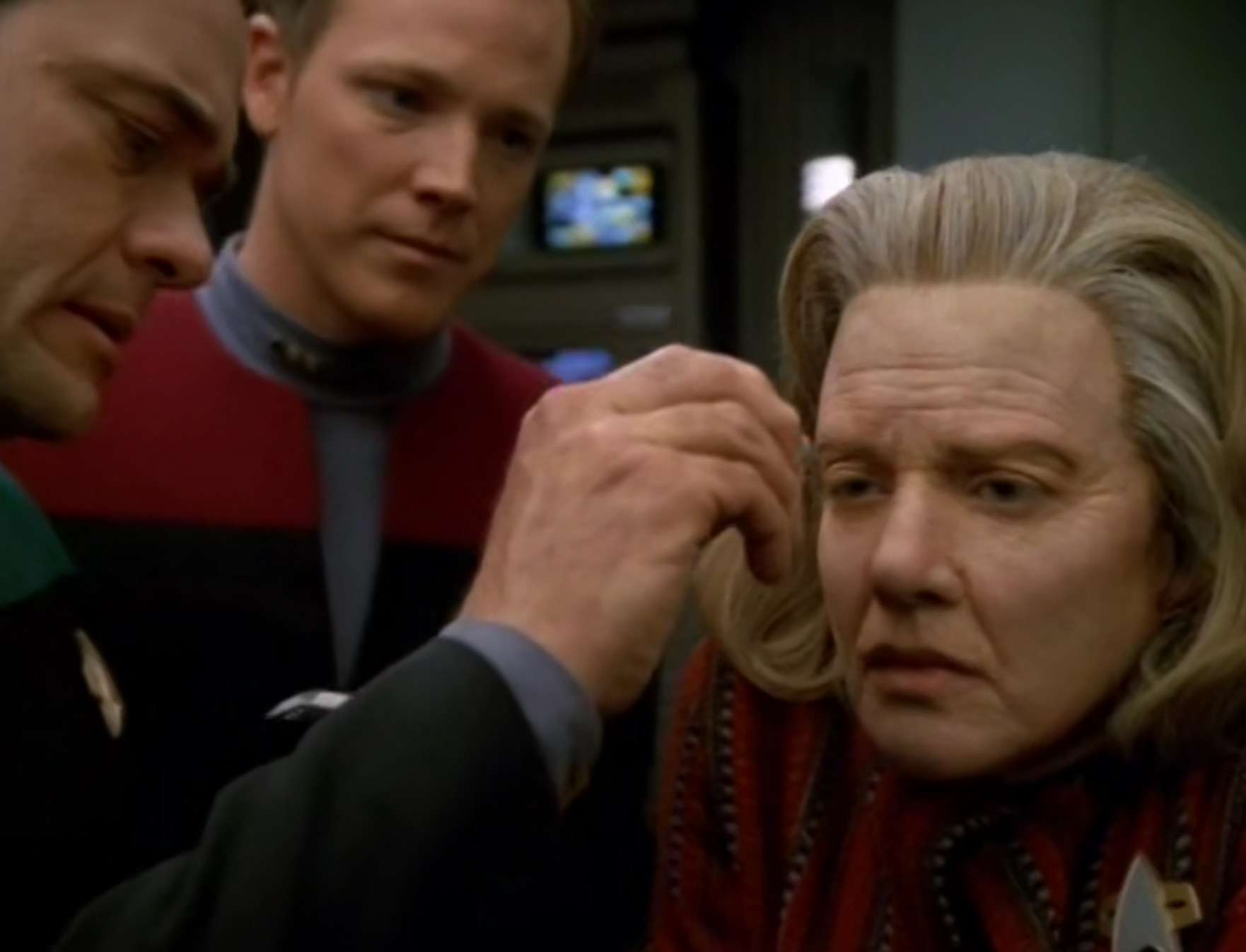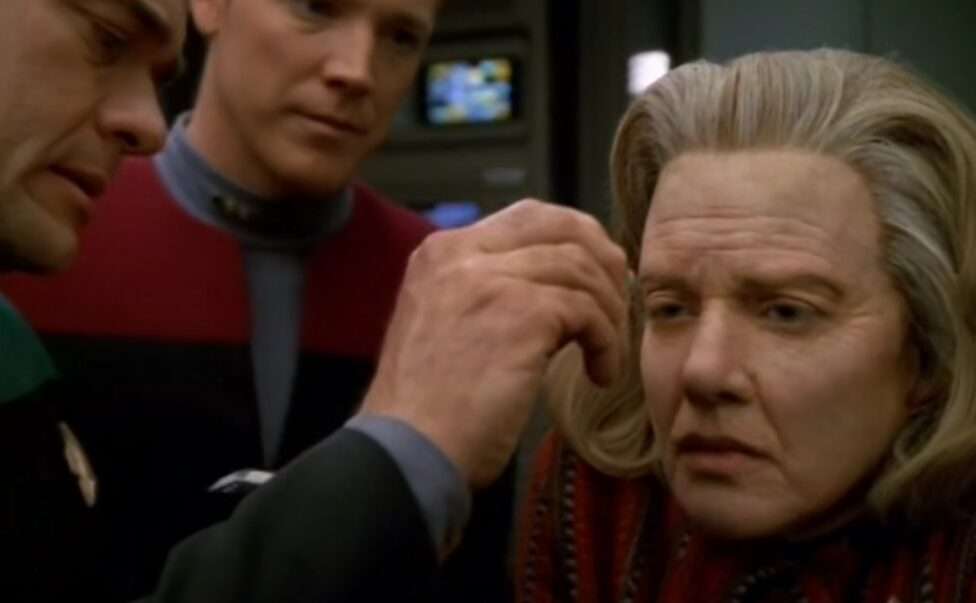 • This is a prequel of sorts to the Voyager two parter next season – “Year of Hell“.  Or that is a sequel to this – unclear which way that is supposed to be.  This manifests as Kes in her time jumps reporting a “Year of Hell” she briefly visited.