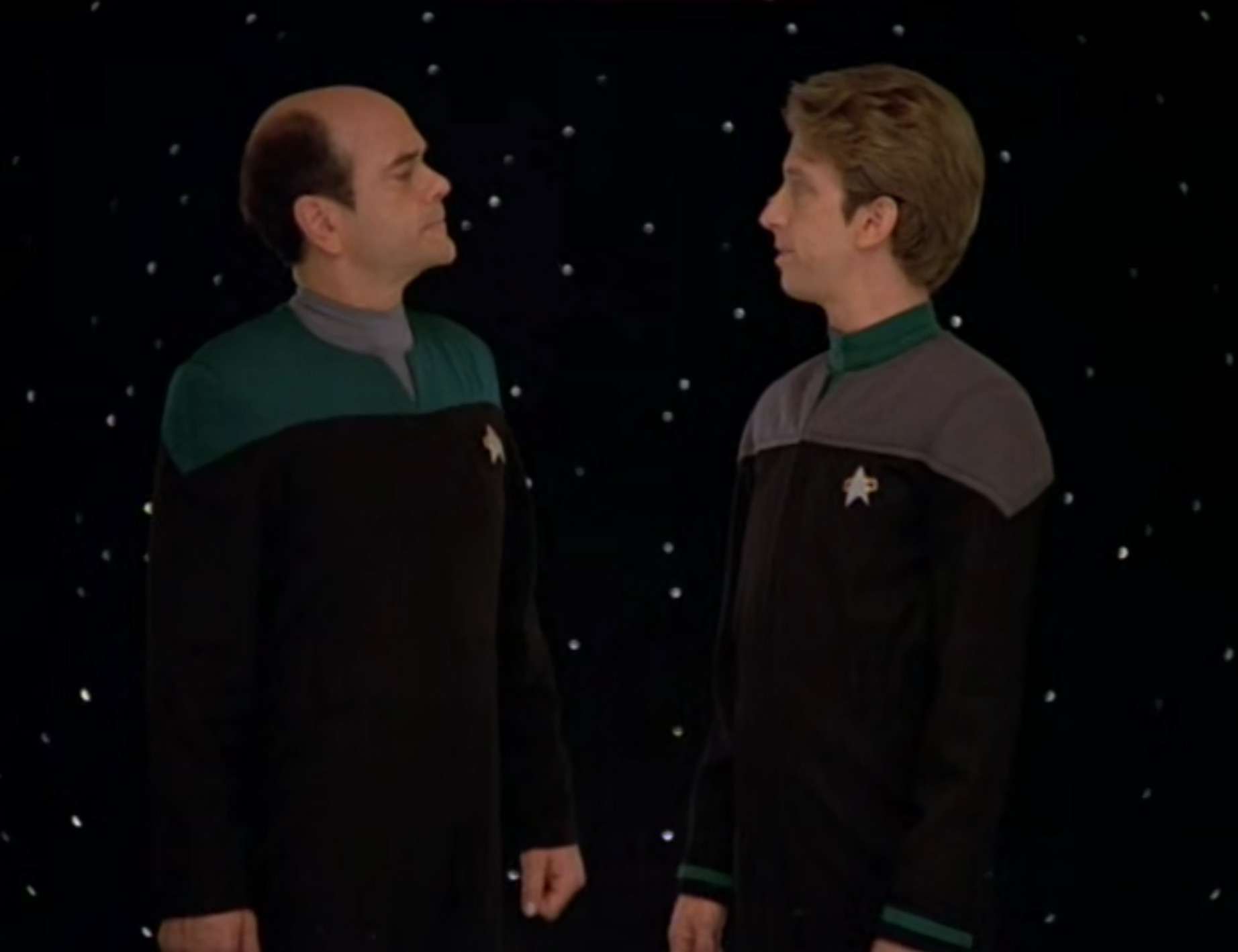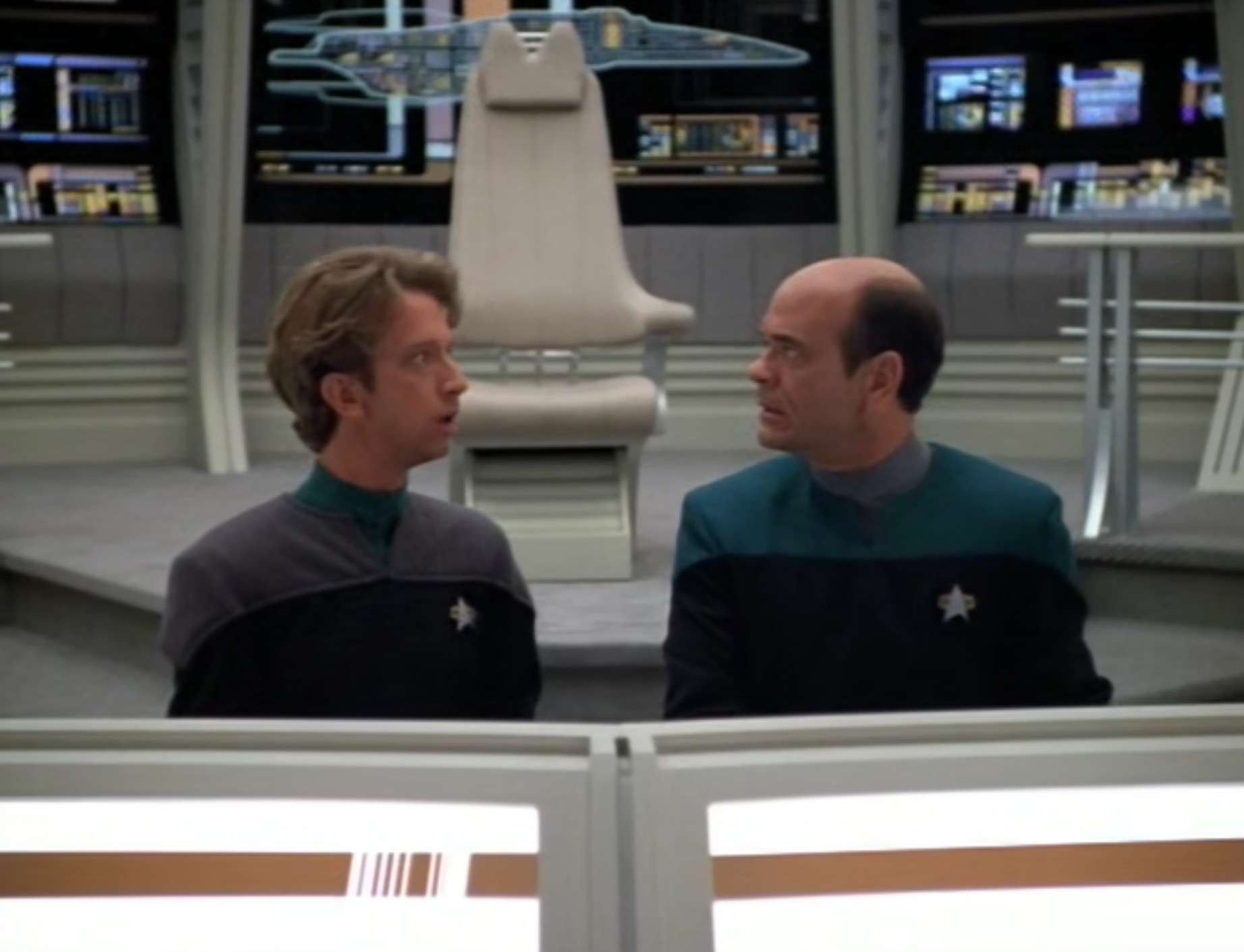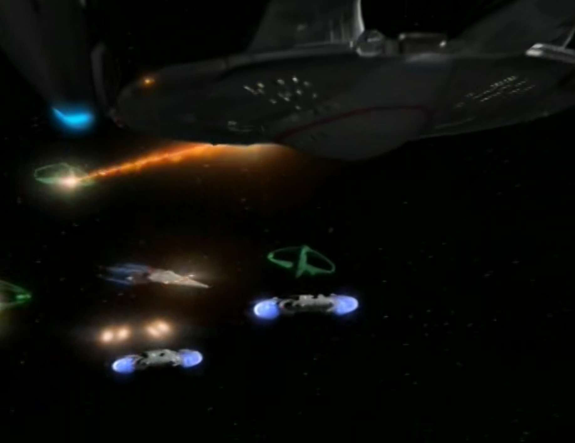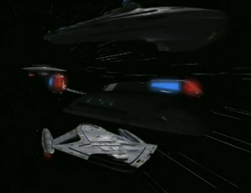 - Multiple Defiant class ships are shown on screen at the same time here. There’s no explanation for this, because at the same time this would have occurred, it was said that the USS Defiant at DS9 was the only such ship in existence.
