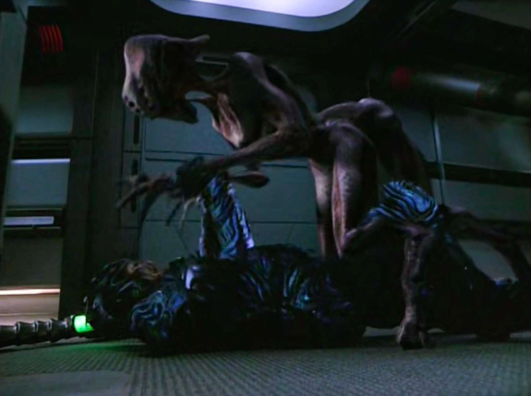 - Clint Carmichael plays two different Hirogen in this episode. He also was one of the Nausicans in the TNG episode “Tapestry“.