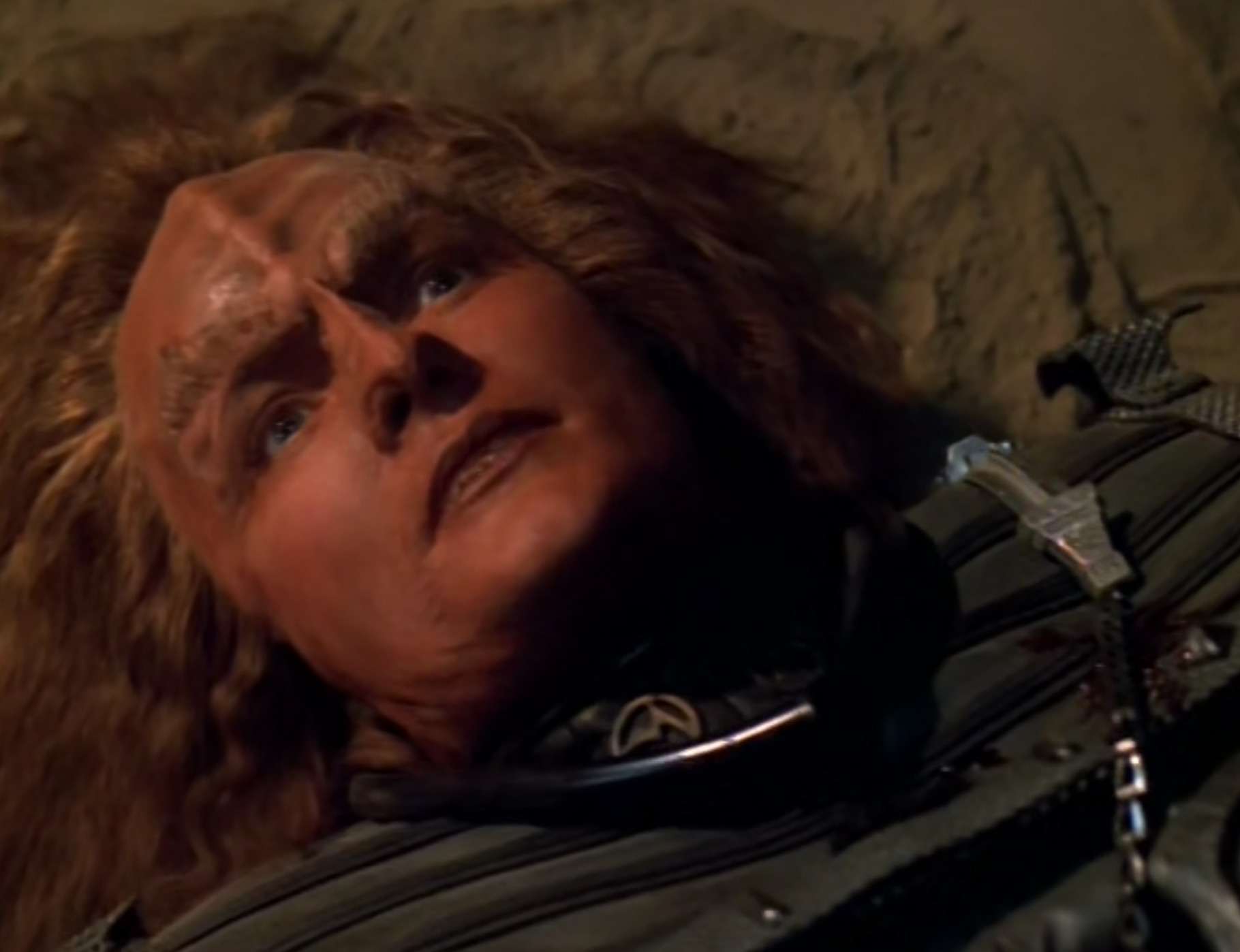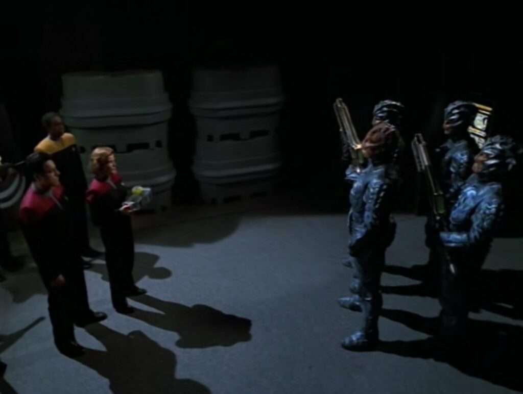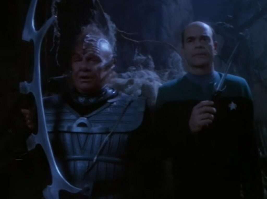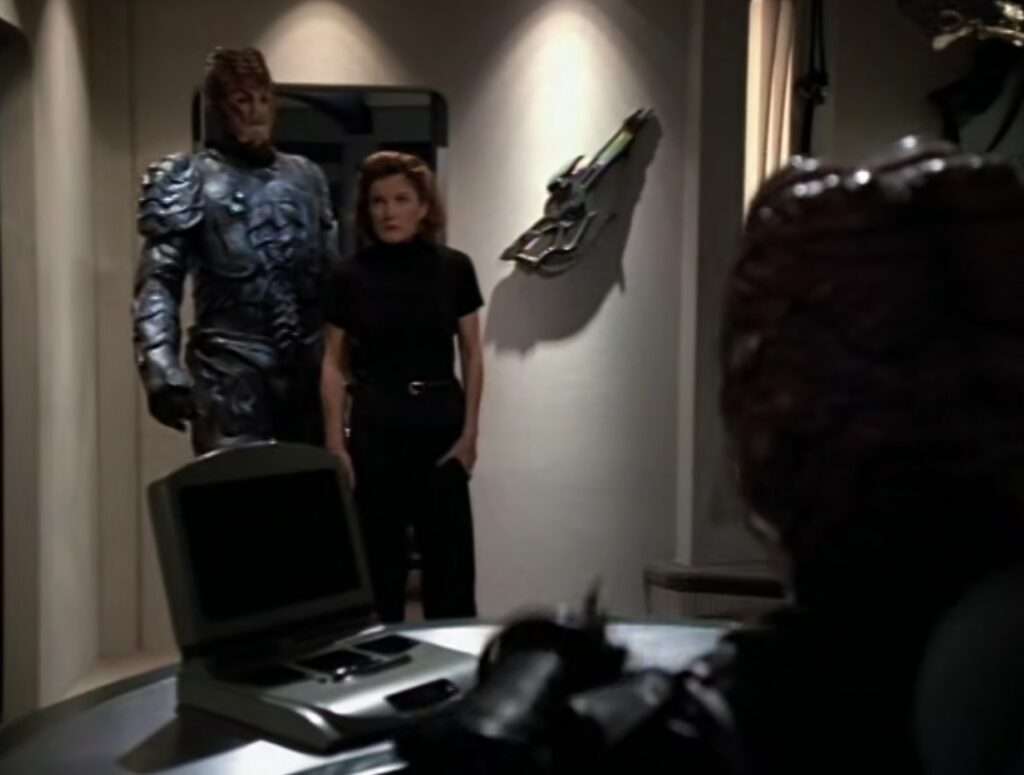 - Roxann Dawson was at this point pregnant in real life. They hide that in the show mostly, but in this two parter, they didn’t – wrote a pregnancy into her holodeck character.
