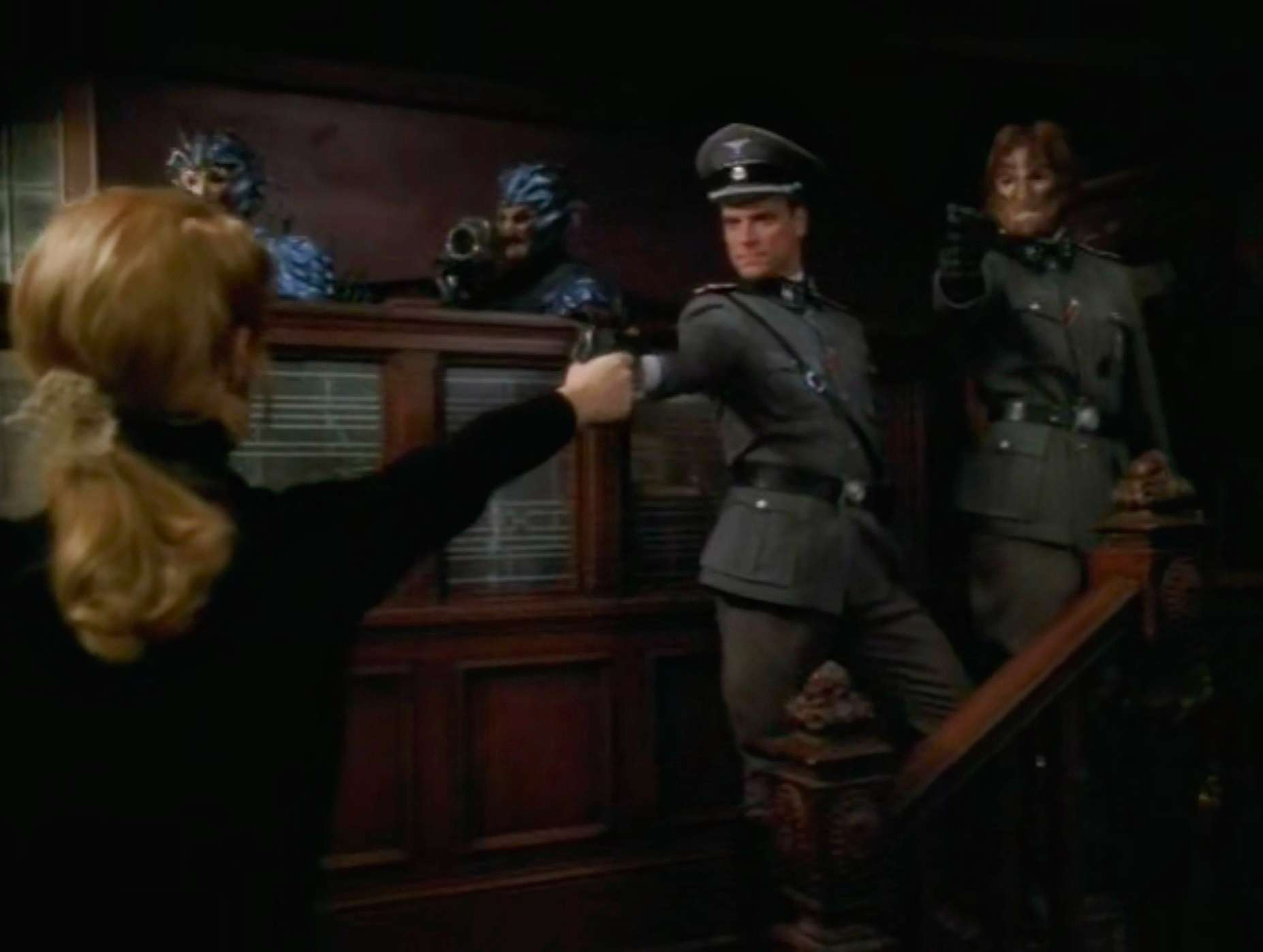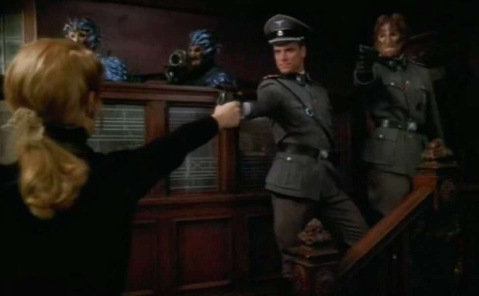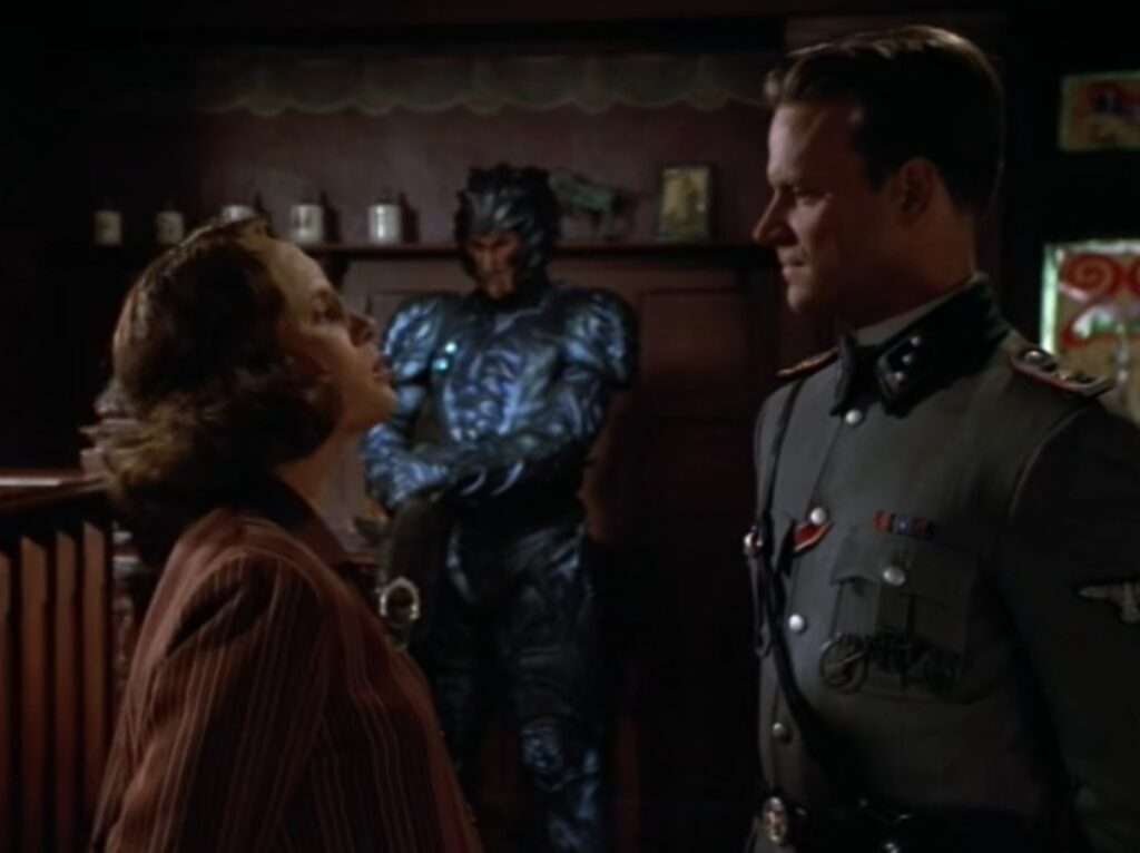 - J Paul Boehmer plays a Nazi SS character here (“Kapitan”). He’s also the titular Borg drone in “One“, a Cardassian named Vernal from DS9’s “Tacking Into the Wind“, the Vulcan Mestral in Enterprise’s “Carbon Creek“, and two different Nazi SS characters in the Enterprise episodes “Zero Hour” and “Storm Front“.