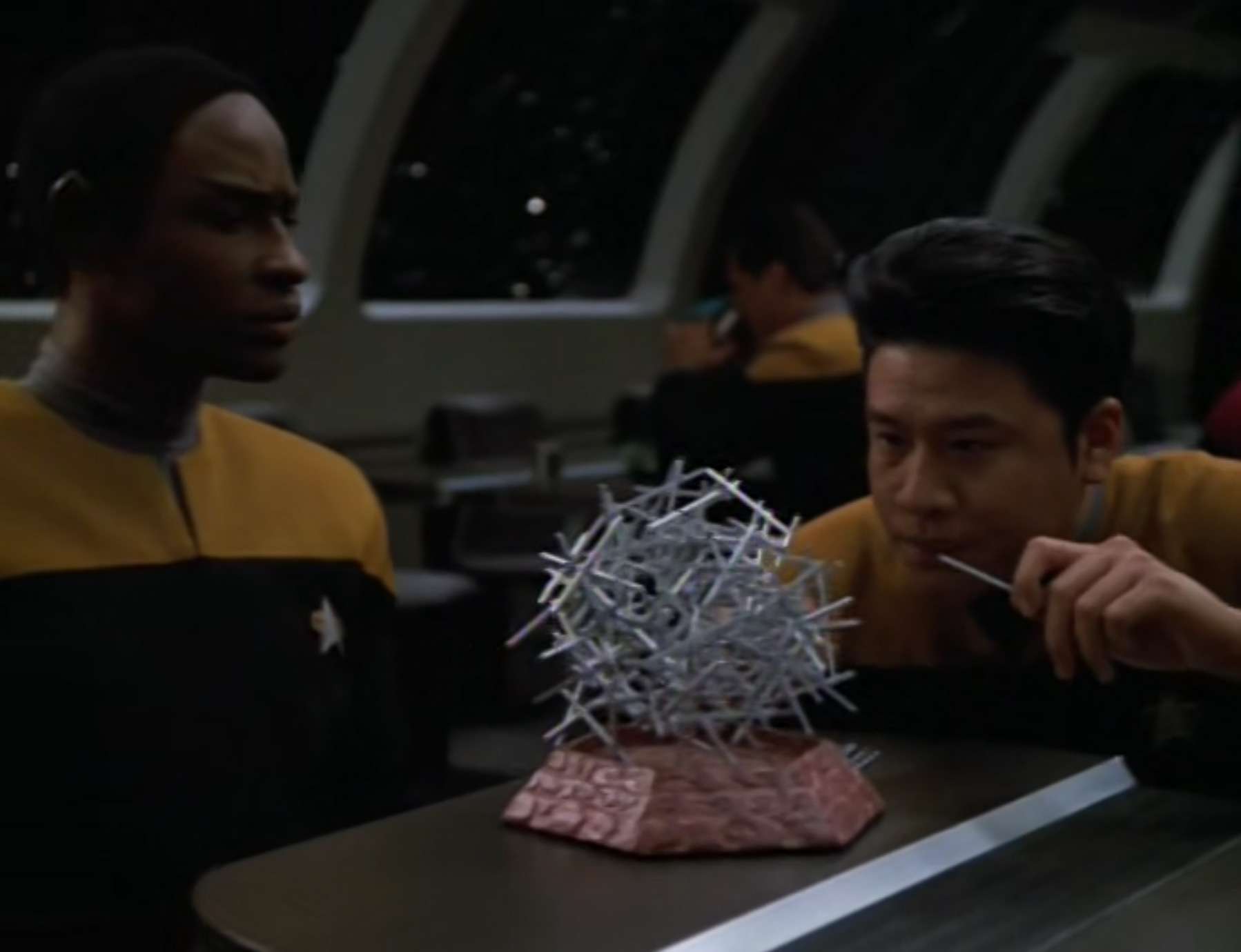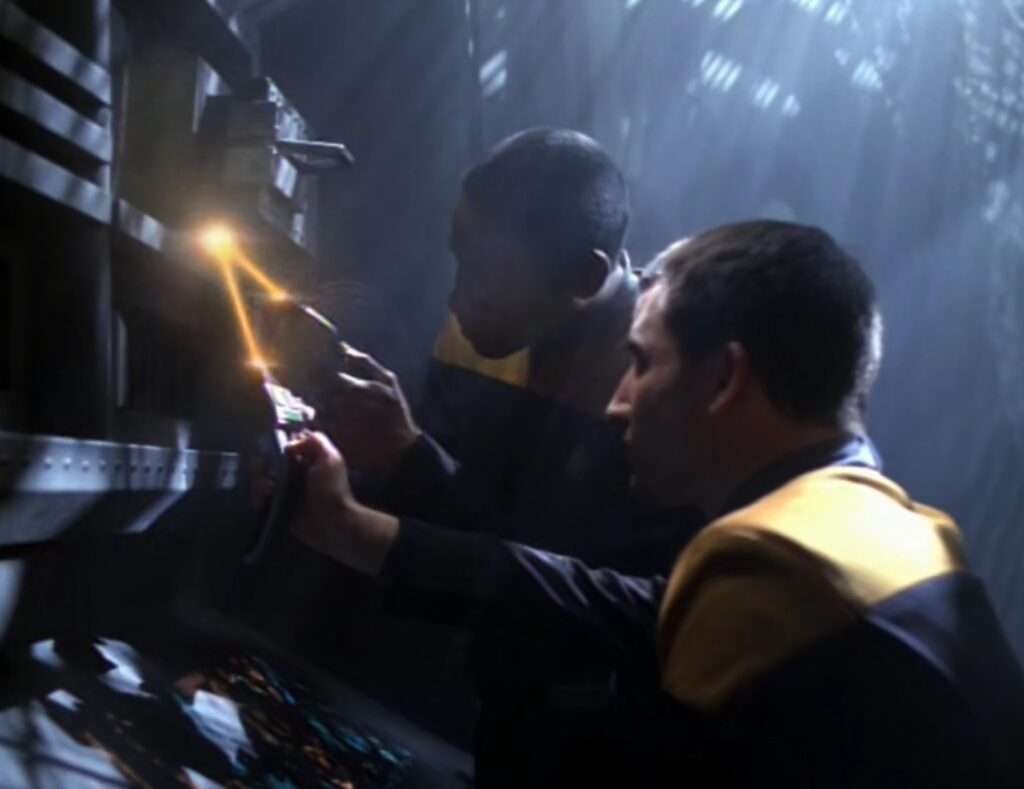 - Jeff Austin plays Allos in this episode. He was also a Bolian security guard in the DS9 episode “The Adversary“.