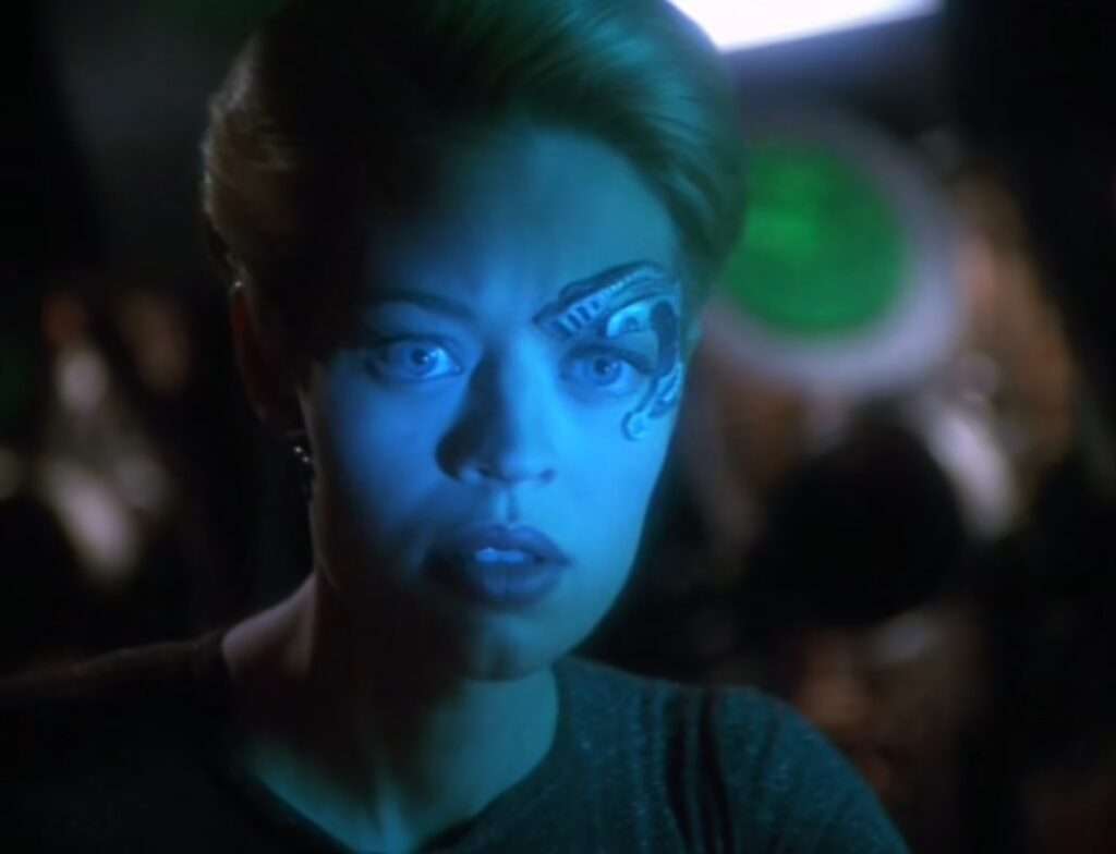 - Torres is only in one scene in this episode, because immediately after filming that, Roxanne Dawson went into labor, and couldn’t film anymore.