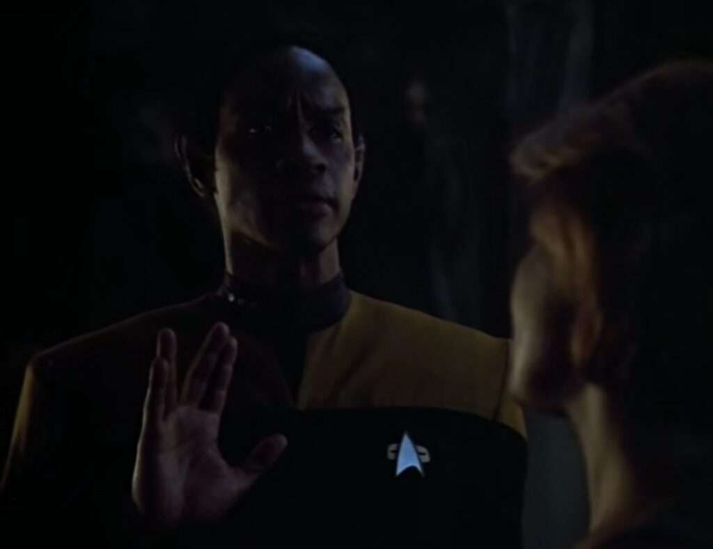 - Peter Slutsker played a Krenim commander here. He also played three separate Ferengi in three different TNG episodes – Nibor in “Menage a Troi“, Reyga in “Suspicions“, & Birta in “Bloodlines“.