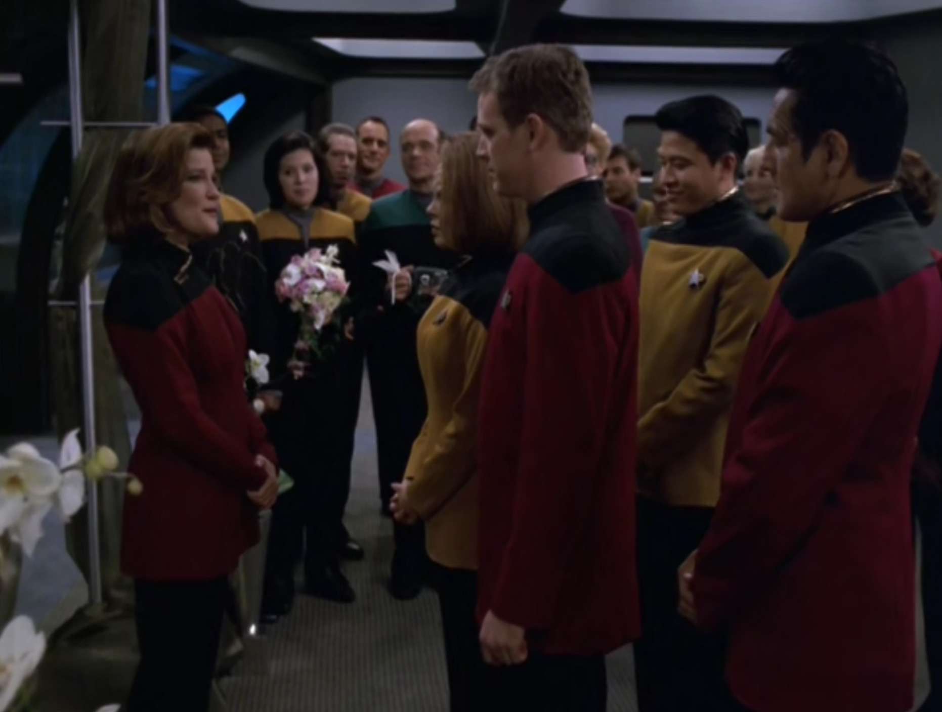 • This episode shows the copies of Torres & Paris getting married. The real versions of the characters would get married in the episode “Drive” from the final season.