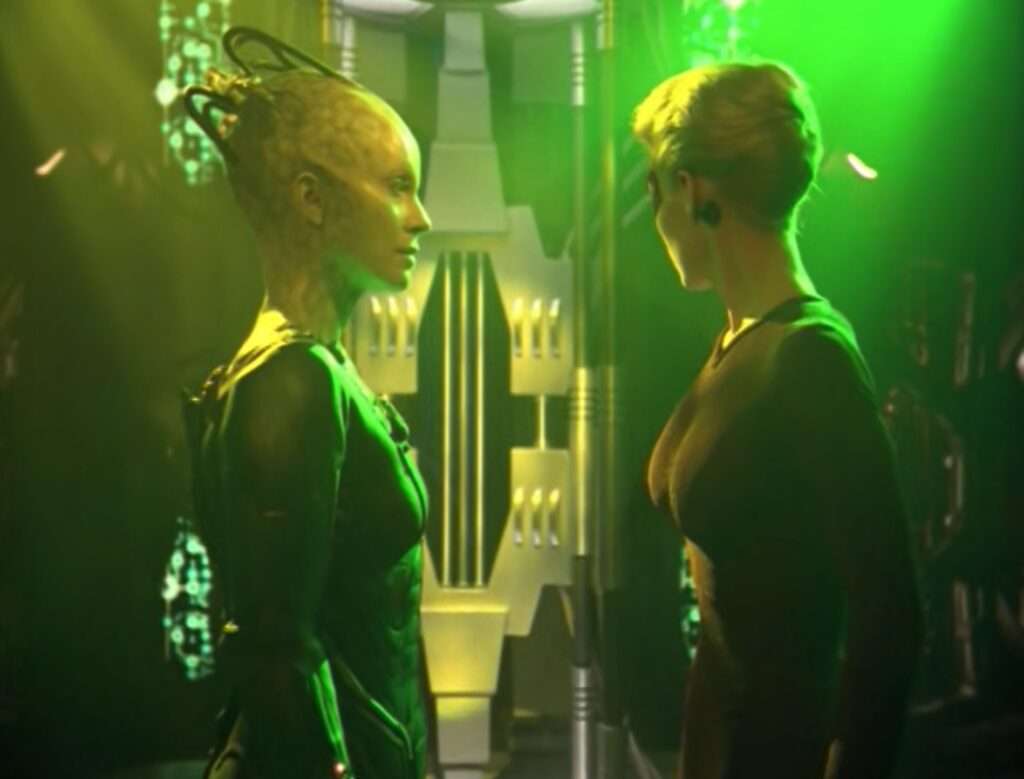 • The Queen’s plan to assimilate humans that she lays out near the end of the episode reminds me somewhat of the plan used in Star Trek Picard’s third season involving hidden transporter code to assimilate the younger officers.