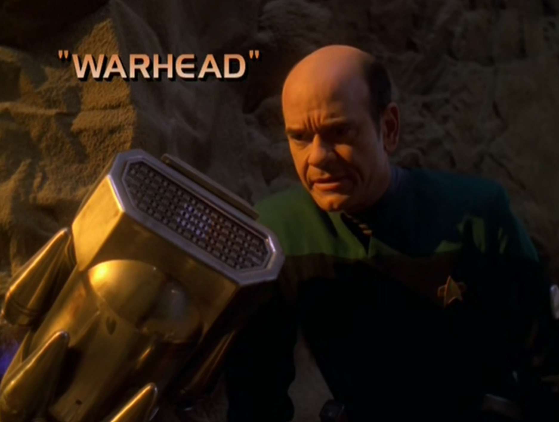 [ Wikipedia | Memory Alpha | IMDB | Amazon US DVD | Delta Flyers Podcast ]#StarTrekMarathon #StarTrek Voyager Ep 119 - Warhead - 19 May 1999 1/2 This reminds me of a combination of plot points from the episodes Warlord, Dreadnought, Revulsion, & Prototype. It's not exactly bad (has a good performance by Robert Picardo), but the plot feels rather recycled from the other