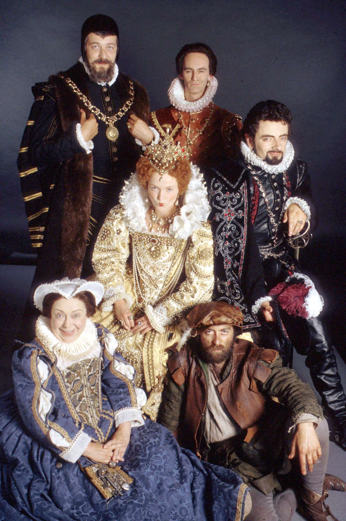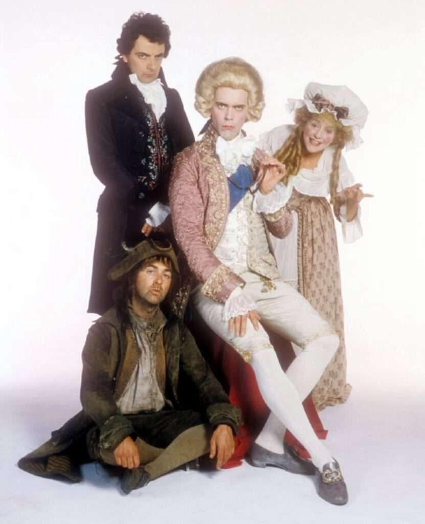 The primary cast are Rowan Atkinson as Edmund Blackadder, Tony Robinson as Baldrick, Hugh Laurie as George, Stephen Fry as Melchet, & Tim McInnerny as a couple of characters. The thing is they vary. only Blackadder and Baldrick are in all the series. Hugh Laurie is a regular in Series 3 & 4, but appears in just one episode of Series 2. The great Brian Blessed is a regular in Series 1 only. Stephen Fry is a regular in Series 2 & 4 with a token appearance in Season 3. Tim McInnerny isn’t in Season 3. As I said, it’s all over the place – a lot of that to do with the change in settings. There aren’t any on screen reasons given for the changes in time, they’re just “there” when they get to a new series.